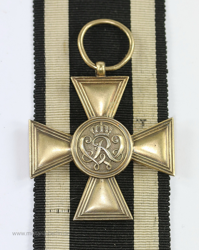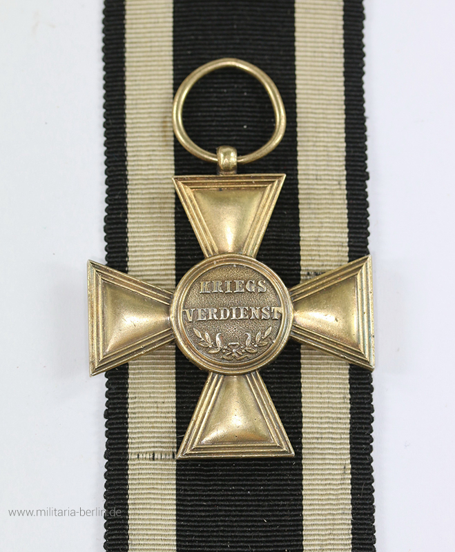 Die ersten Kreuze wurden aus Gold gefertigt. Im 1. Weltkrieg erfolgte die Umstellung auf Kreuze aus vergoldeten Silber (938). Im Medaillon die von einer Krone überragte und verschlungene Initiale des Stifters „WR“ für Wilhelm Rex (lat. Für König). Rückseitig die Inschrift „KRIEGS VERDIENST“ und darunter zwei kleine Lorbeer- und Eichenzweige.