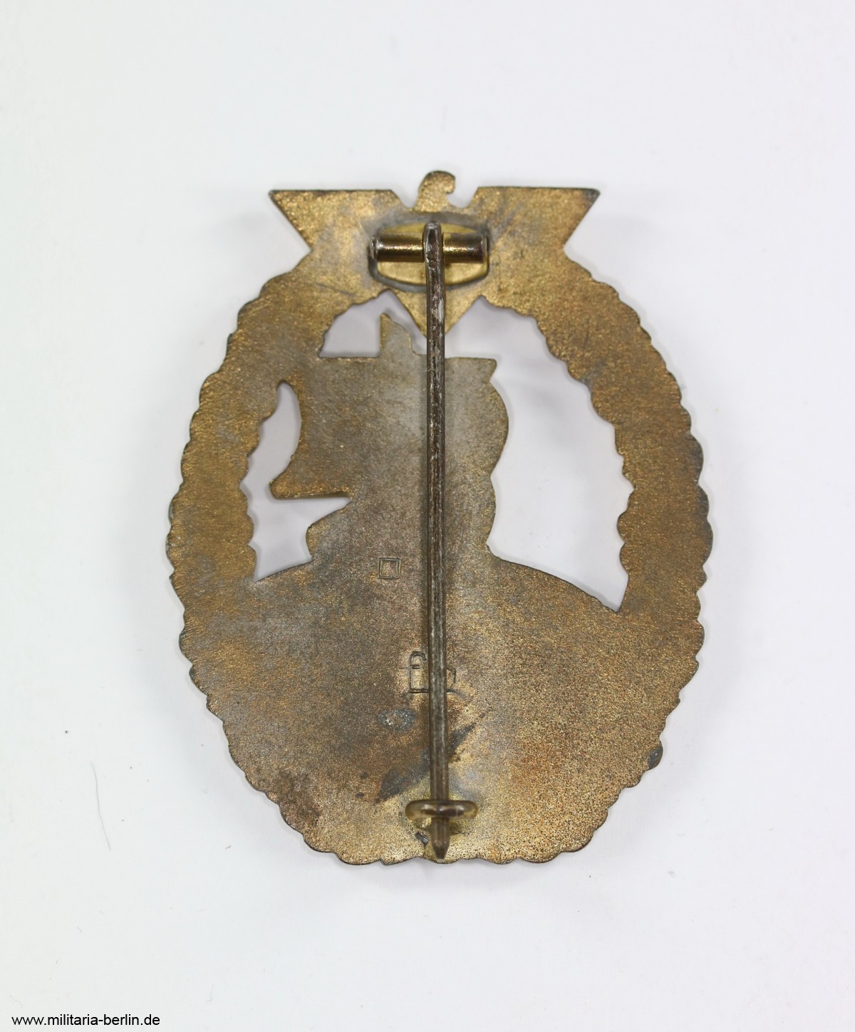 Hochovales Abzeichen aus Buntmetall, oder Zink, in einigen besonderen Fällen auch aus Silber (Sterlingsilber). Zentral ein separat aufgelegter Globus. Oben auf den Globus ein stilisiertes Wikingerschiff mit gesetzten Segel nach links fahrend. Umgeben durch einen unten gebundenen goldenen Eichenlaubkranz (typisch für alle Marine Abzeichen). Mittig an der höchsten Stelle der Hoheitsadler der Kriegsmarine, mit Hakenkreuz in den Klauen.