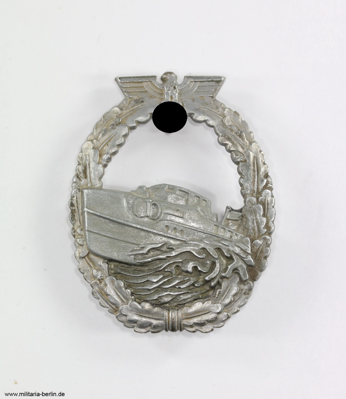 Hochovales Abzeichen aus Buntmetall, bzw. Zink. Zentral ein nach links fahrendes, stilisiertes Schnellboot. Umgeben durch einen unten gebundenen goldenen Eichenkranz (typisch für alle Marine Abzeichen). Mittig an der höchsten Stelle der Hoheitsadler der Kriegsmarine, mit Hakenkreuz in den Klauen. Das Design des Abzeichens wurde 28. Januar 1943 leicht geändert. Viele Schnellbootfahrer beschwerten sich über das etwas „klobig“ dargestellte S-Boot im Abzeichen. Diese Abzeichen mit dem Schnellboot mit den fast geraden Bug, wird als 1. Form bezeichnet. Das neu gestaltete Abzeichen mit dem Boot mit den spitzen Bug wird als 2. Form bezeichnet. Auch der Hoheitsadler der 2. Form wurde wuchtiger, mit weit ausladenden Flügeln gestaltet. Beide Entwürfe stammen von Wilhelm Ernst Peekhaus aus Berlin. Der häufigste Hersteller dieses Abzeichens war die Firma Schwerin Berlin, es gibt aber auch andere.