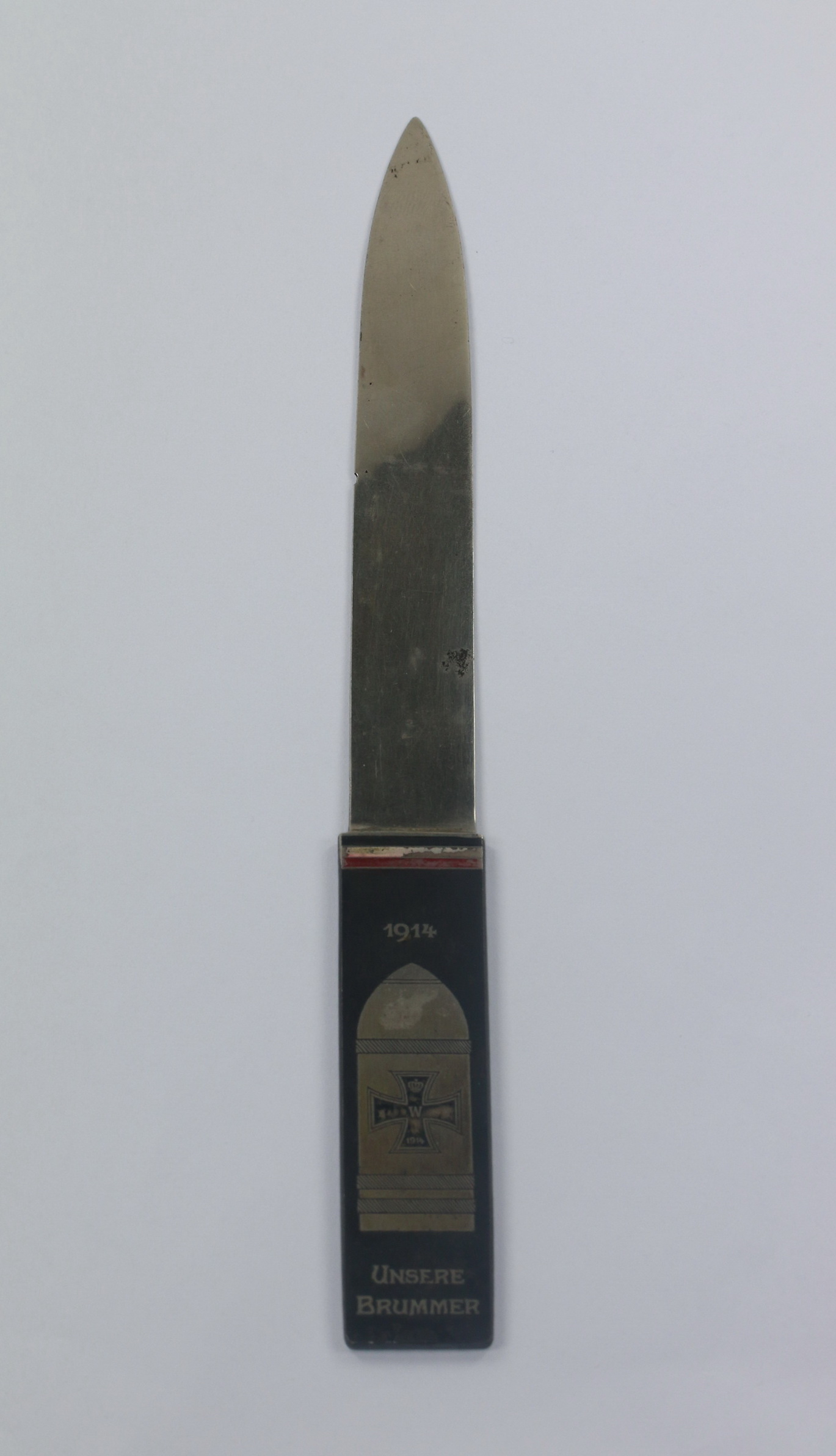 In a very good, slightly used condition. On the grip the flag colours Red, White, Black and „1914“, under that a large artillery shell and „Unsere Brummer“. Length approx. 23 cm.