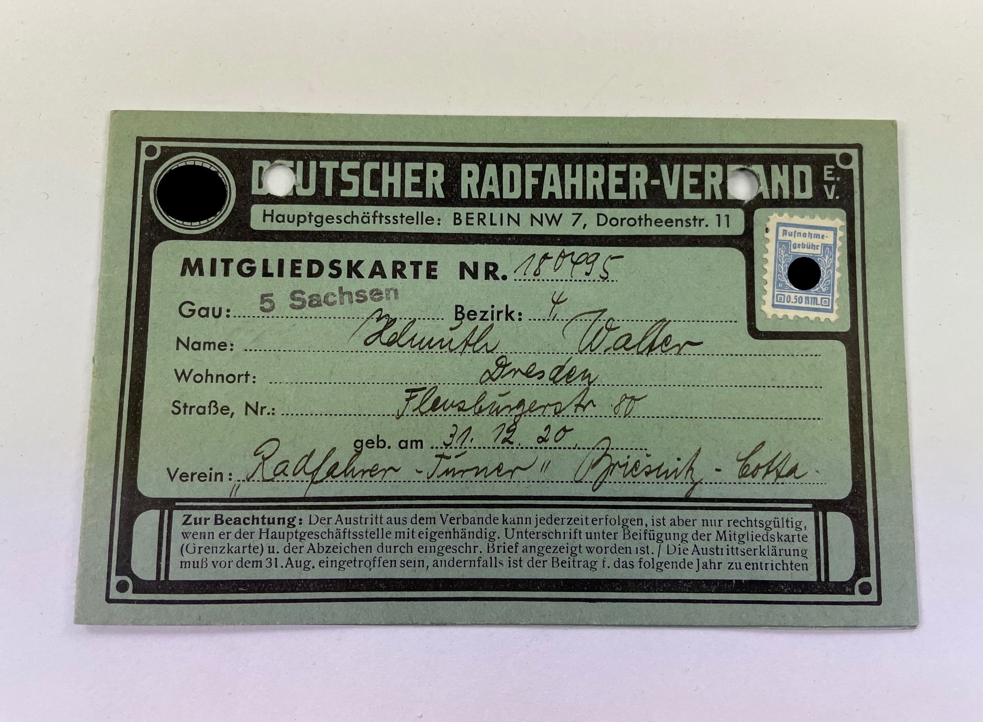 3. Reich, Mitgliedskarte Deutscher Radfahrer-Verband e.V.