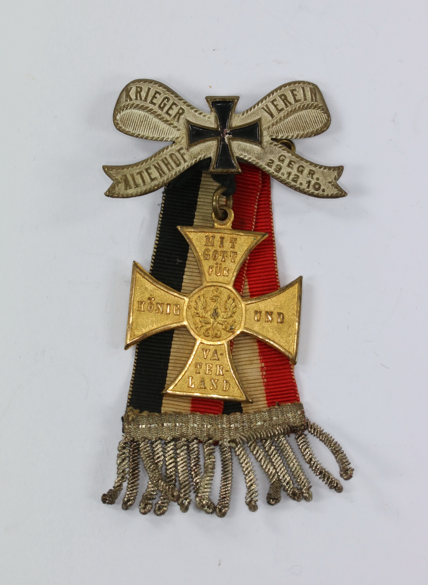 Sehr guter, nur leicht getragener Zustand. Auf der Schleife „Krieger Verein Altenhof Gegr. 29.12.10“ auf den Kreuz „Mit Gott für König und Vaterland“.