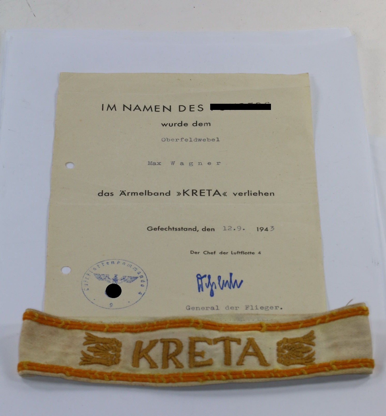 Awarded on 12.9.1943 to the Oberfeldwebel Max Wagner. Machine embroided yellow threads on white background and in a very good, slightly worn condition. Removed from the jacket and still sewn together at the ends.