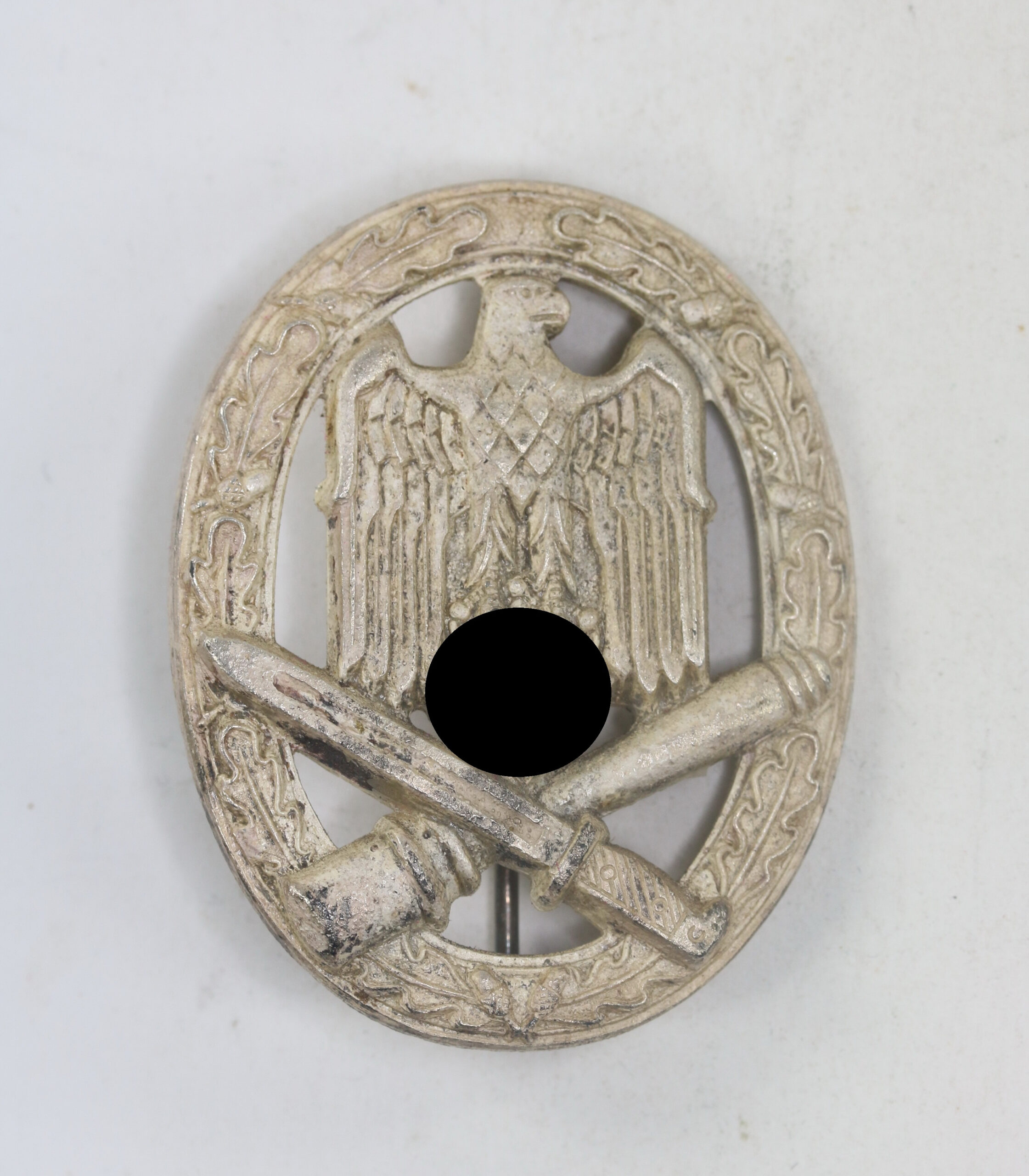 Zink, excellenter, ungetragener Zustand. Mit vollständiger frostiger Versilberung und leichten Ansätzen von Patina. Mit Hersteller „W“ für die Firma Karl Wurster, Markneukirchen, links neben den Nadelbock.