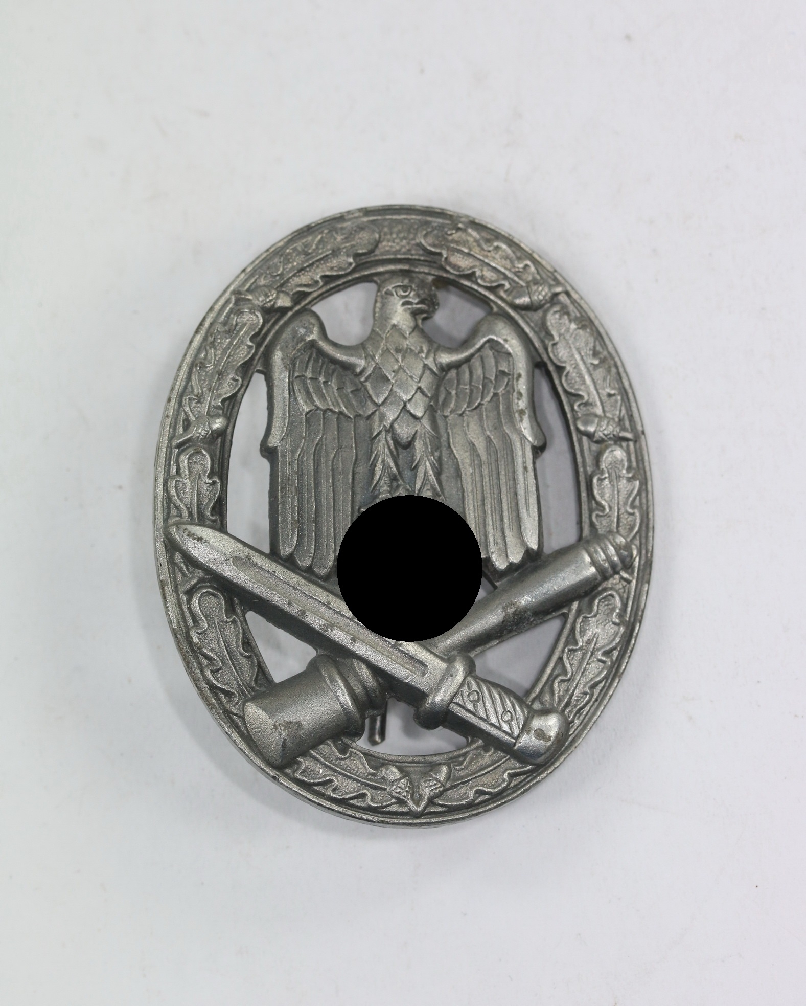 Zink, sehr guter, nur minimal getragener Zustand. Mit vollständiger Versilberung. Mit Hersteller „ÜÜ“ für die Firma Ferdinad Wiedmann, Frankfurt am Main. Siehe auch GCA-Datenbank.