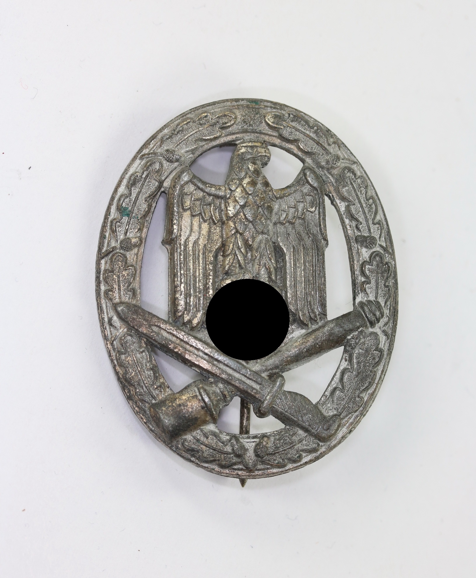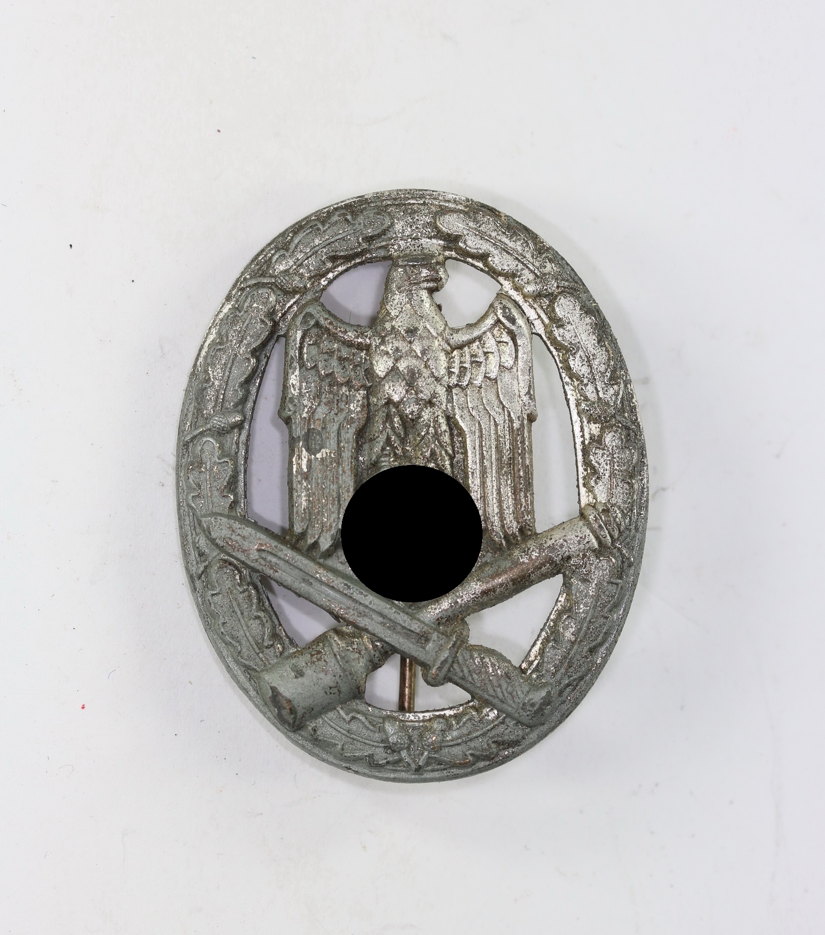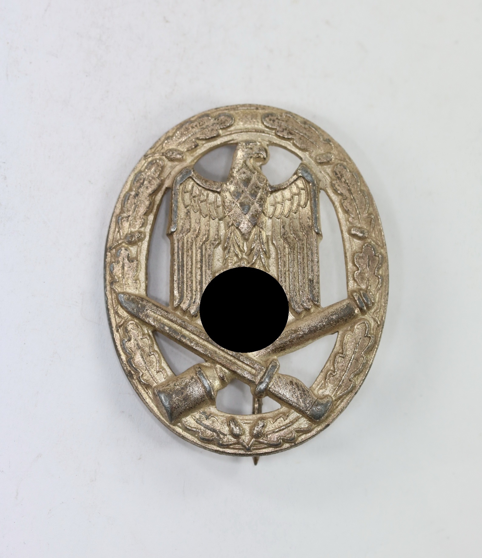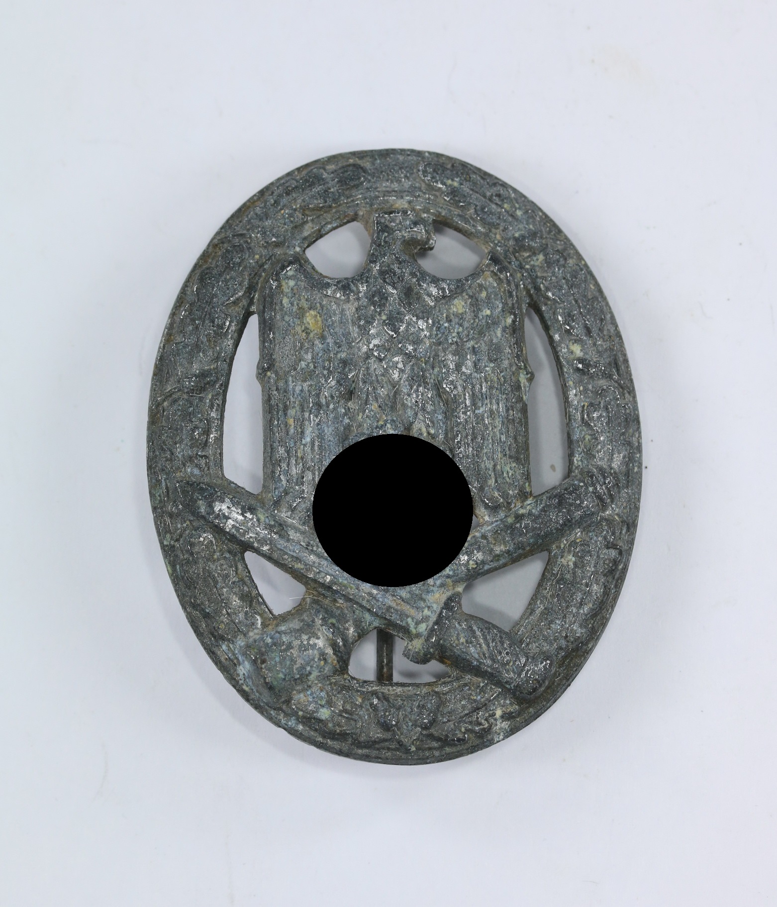 Zinc based and in a very good, probably unworn condition with practically all of the matt silver plate still present. The swastika and high points burnished and all with some patina.
