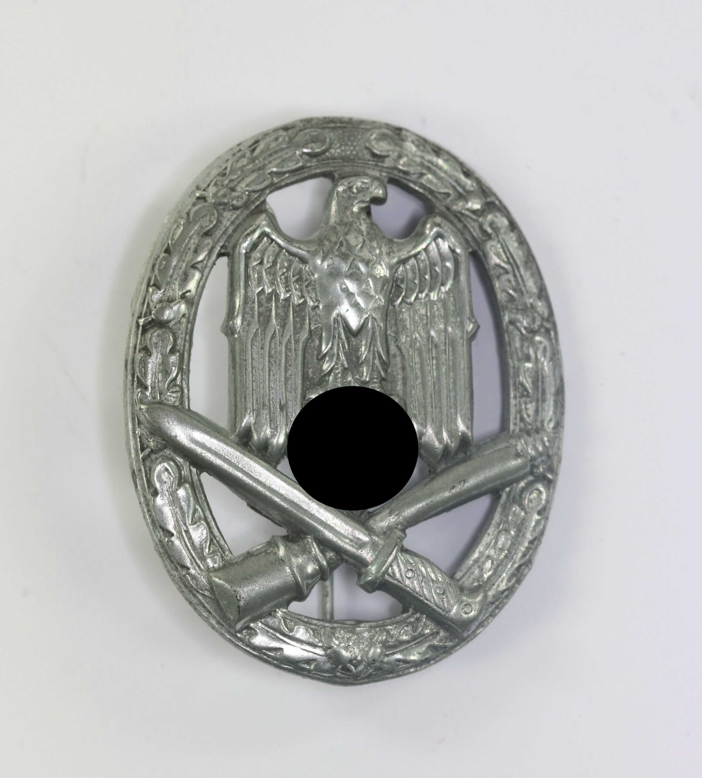 Zink, sehr guter, nur minimal getragener Zustand. Mit vollständiger Versilberung (chrom Finish). Ohne Hersteller, aber eine bekannte Variante der Firma Rudolf Karneth, Gablonz. Siehe GCA-Datenbank. Mit typischen, eingequetschten Nadelsystem.
