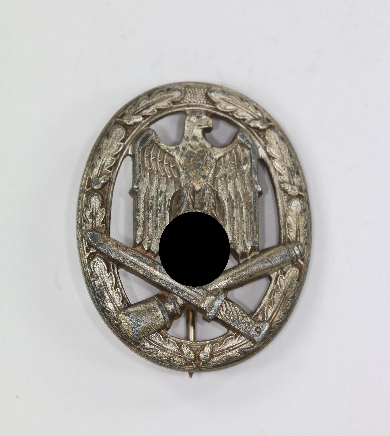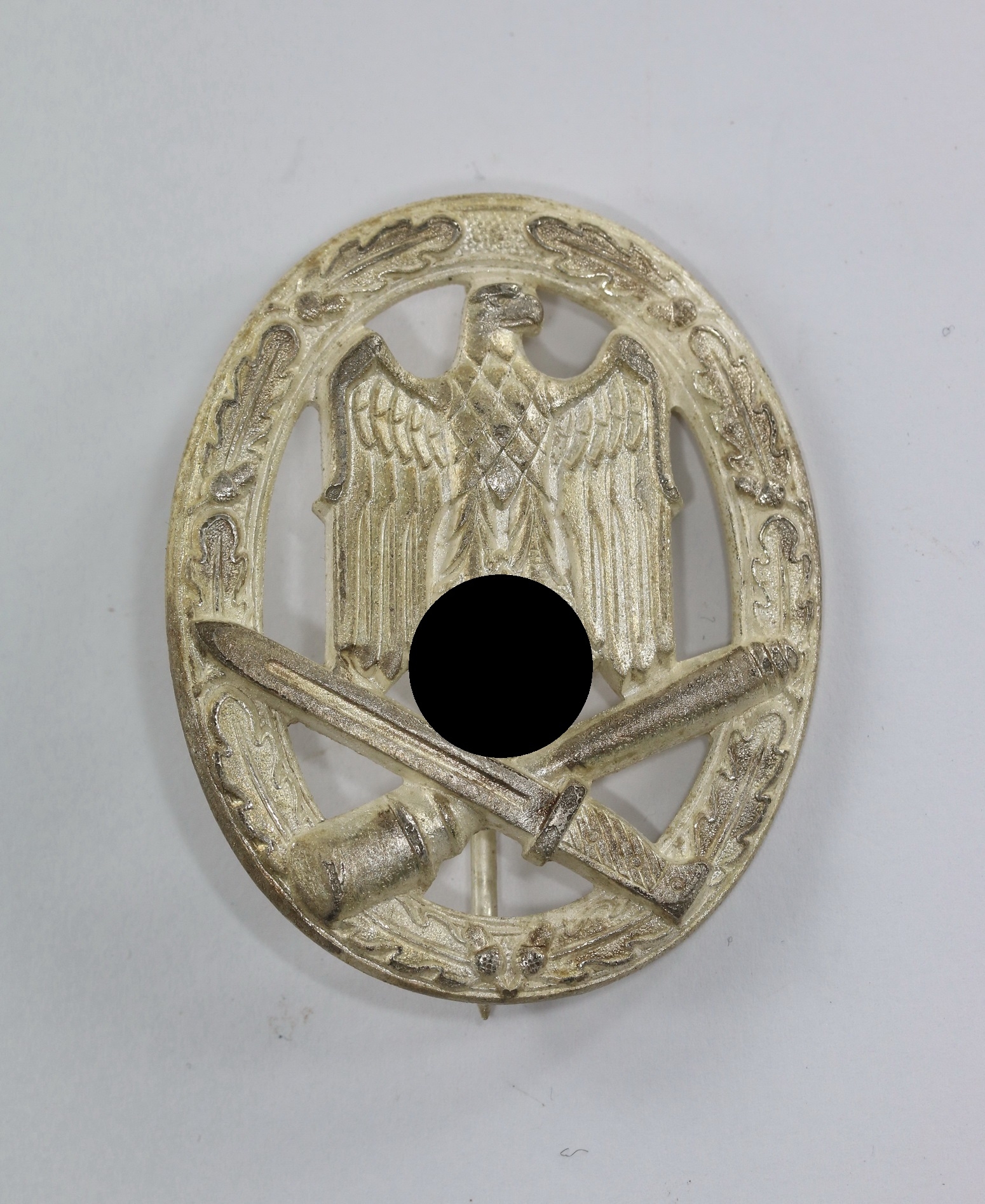 Not marked but a known variation that has been attributed to the company of Steinhauer & Lück, Lüdenscheid. Typical pin construction with hook on an oblong type plate. See Frank Heukemes, The General Assault Badge.