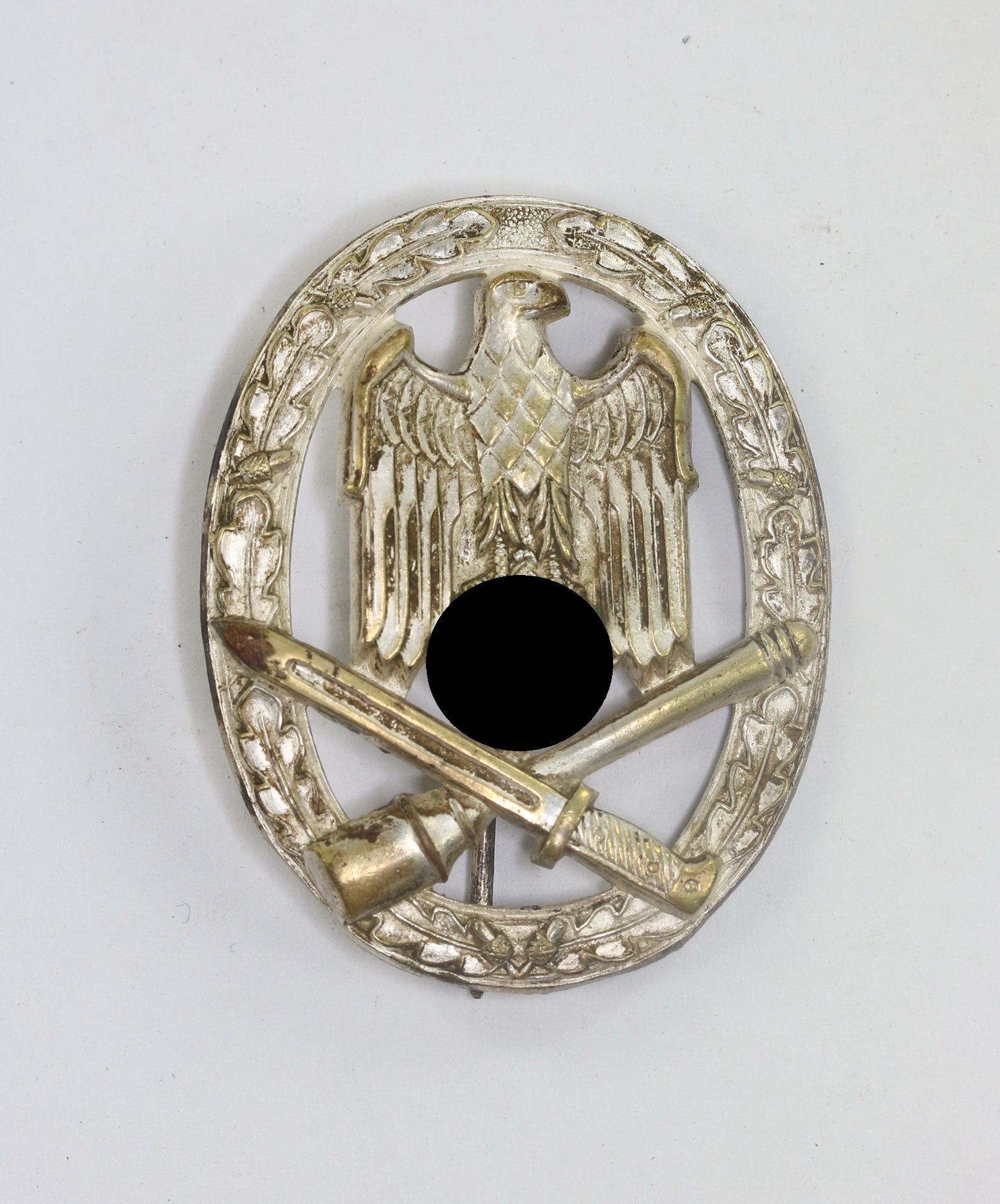 Buntmetall, sehr guter, leicht getragener Zustand. Mit fast vollständiger, frostiger Versilberung. Hakenkreuz und Kanten poliert. Ohne Hersteller, aber eine bekannte Variante der Firma Wilhelm Deumer, Lüdenscheid. Siehe GCA-Datenbank.