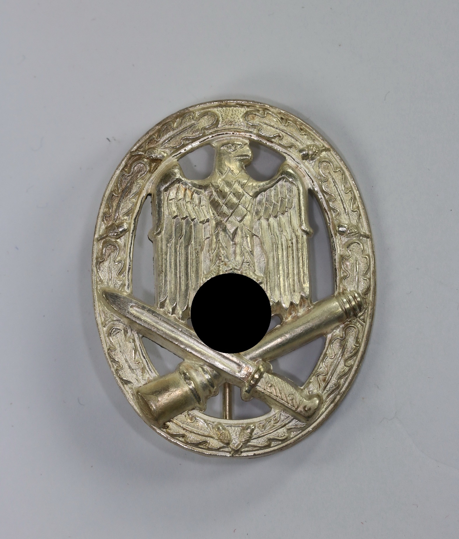 Buntmetall(!), massiv(!), excellenter, ungetragener Zustand. Mit vollständiger, frostiger Versilberung. Hakenkreuz und Kanten poliert. Ohne Hersteller, aber eine bekannte Variante, der Firma Karl Wurster, Markneukirchen (W).