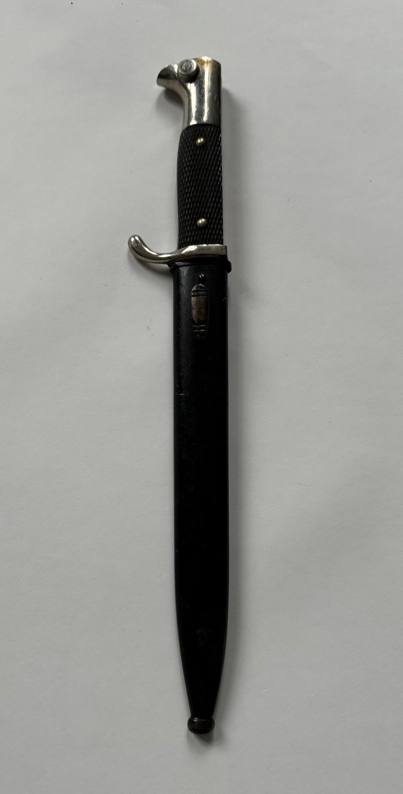 Ausführung mit kurzer Klinge, sehr guter, nur leicht getragener Zustand. Die Griffschalen fest und ohne Fehler. Der Drücker funktionsfähig. Die Scheide ohne Fehler mit noch fast vollständiger Lackierung. Die Klinge blank und fehlerfrei. Auf der Klinge der Hersteller „Carl Eickhorn Solingen“. Vollständige mit Stoßleder.