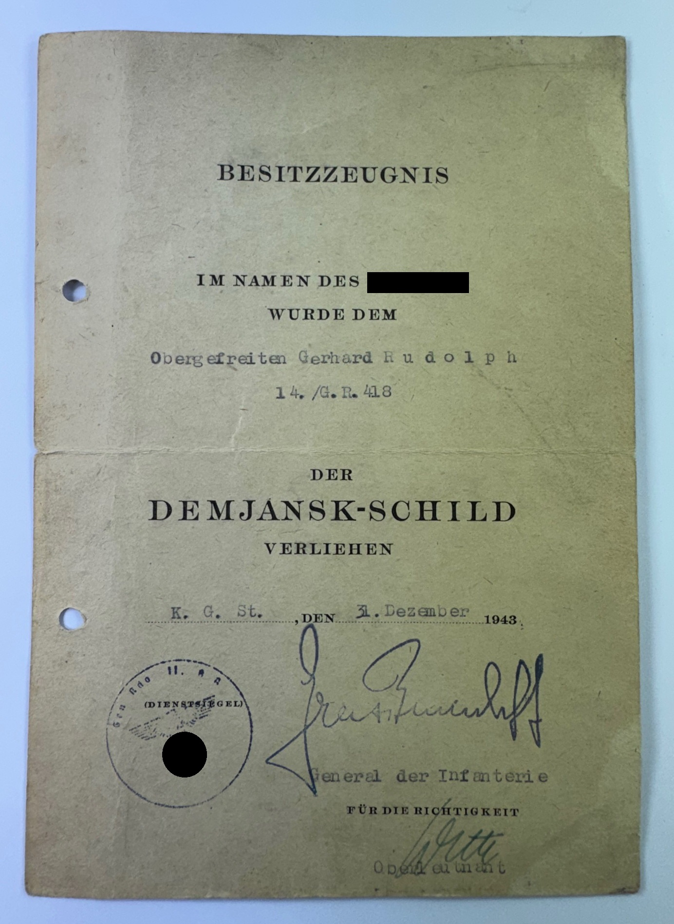 Gelocht und einmal gefaltet, sonst sehr guter, nur leicht gebrauchter Zustand. Maße ca. 21 x 14,5 cm.