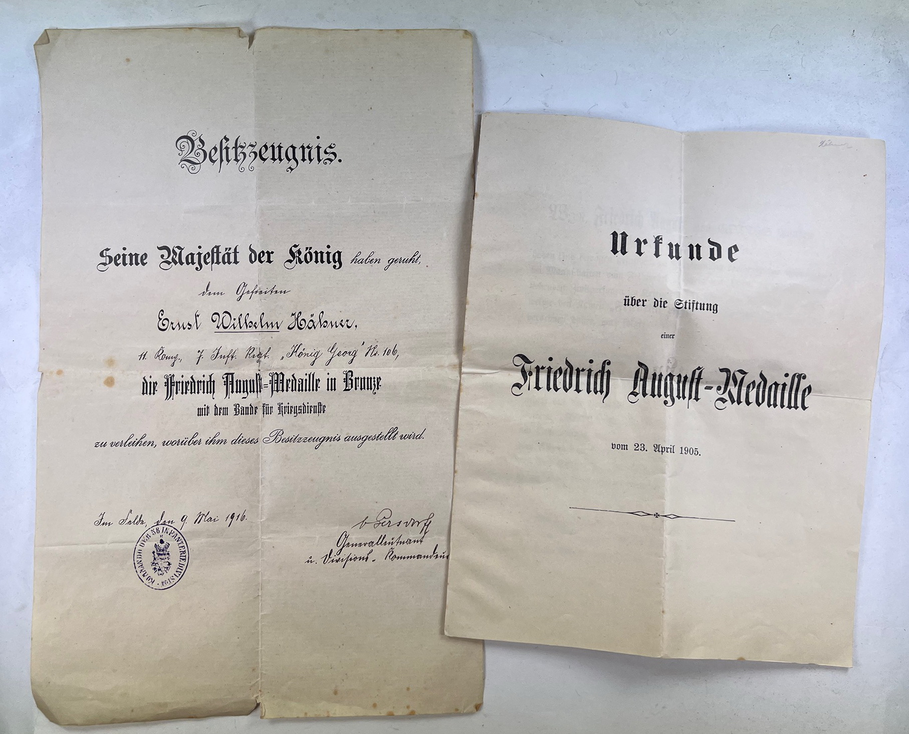 Besitzzeugnis Friedrich-August Medaille in Bronze + Urkunde über die Stiftung