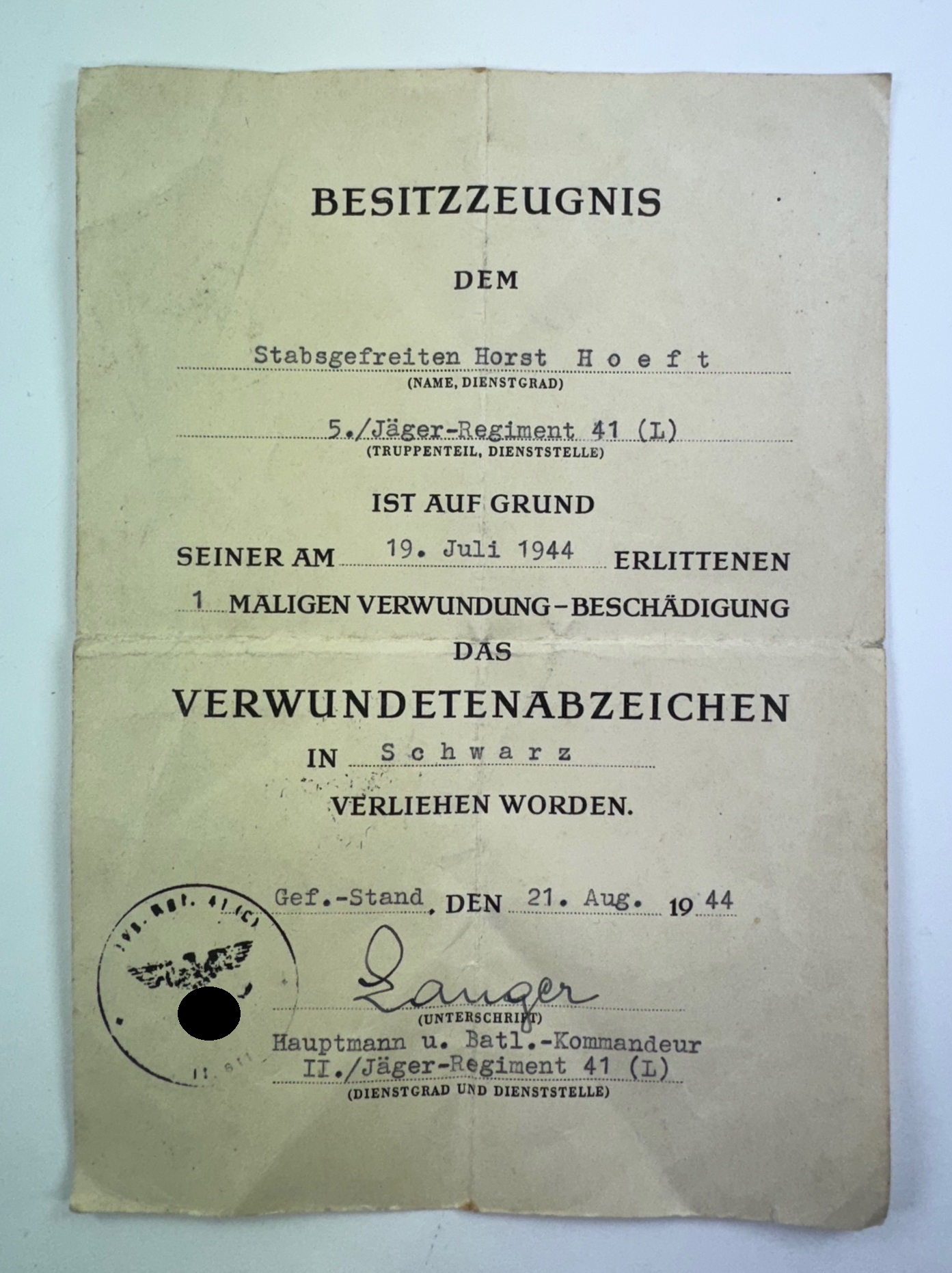 Document for the Eastern Front Medal, Luftwaffen Felddivision, Jäger-Regiment 41 (L)