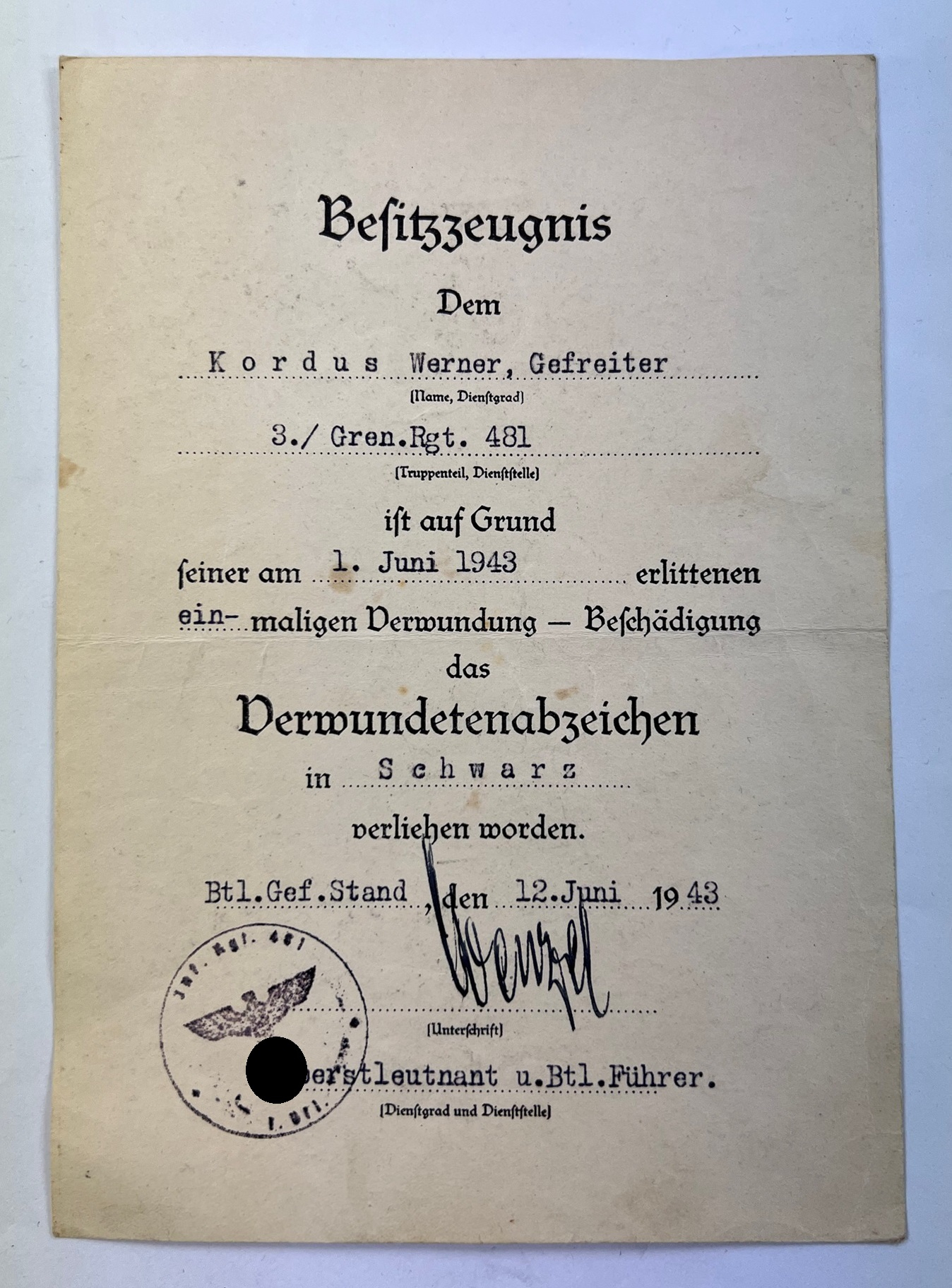 Document for the Black Wound Badge 1939, Grenadier regiment 481
