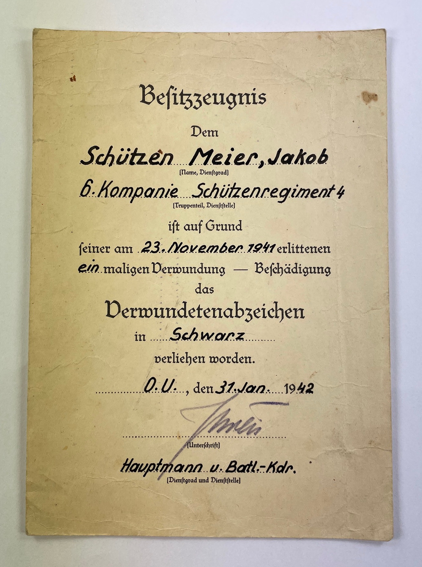 Document for the Black Wound Badge, Schützenregiment 4