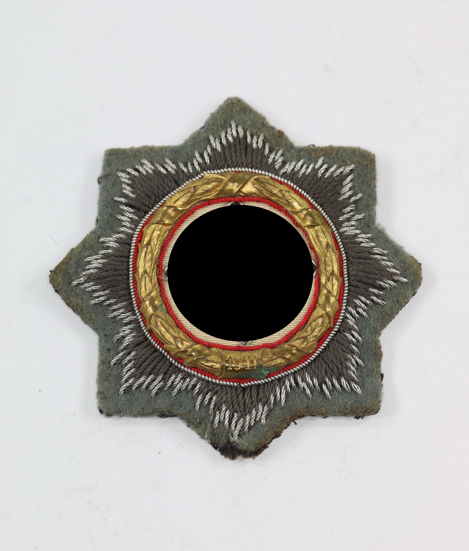 In a very good, slightly worn condition. Embroided on Army type cloth with tombak/brass based and gilt plated wreath.