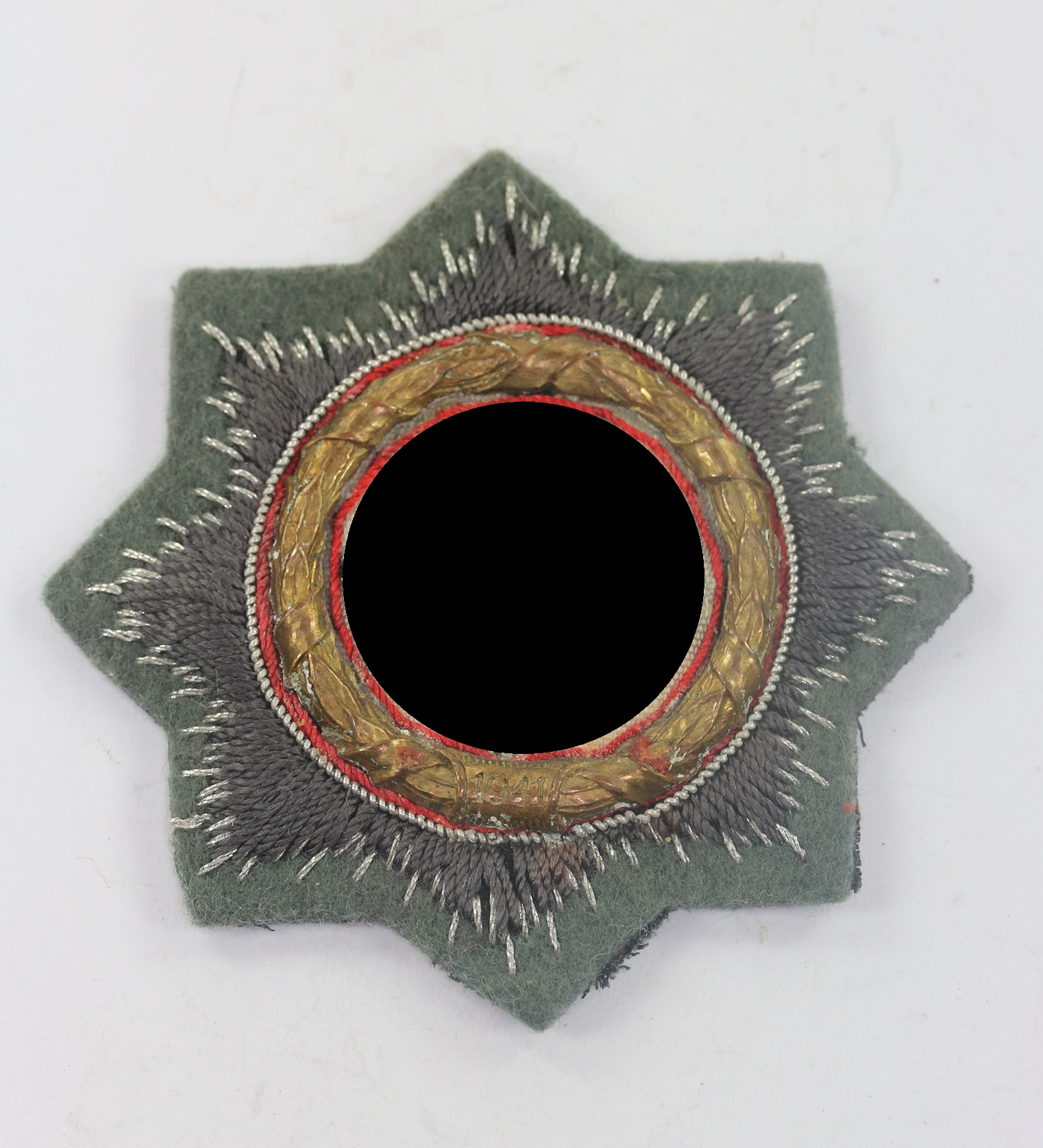 Sehr guter, nur leicht getragener Zustand. Metall Kranz auf Heeresstoff. Ohne Hersteller, aber eine bekannte Variante. Mit noch fast vollständiger dunkler Papier Abdeckung.
