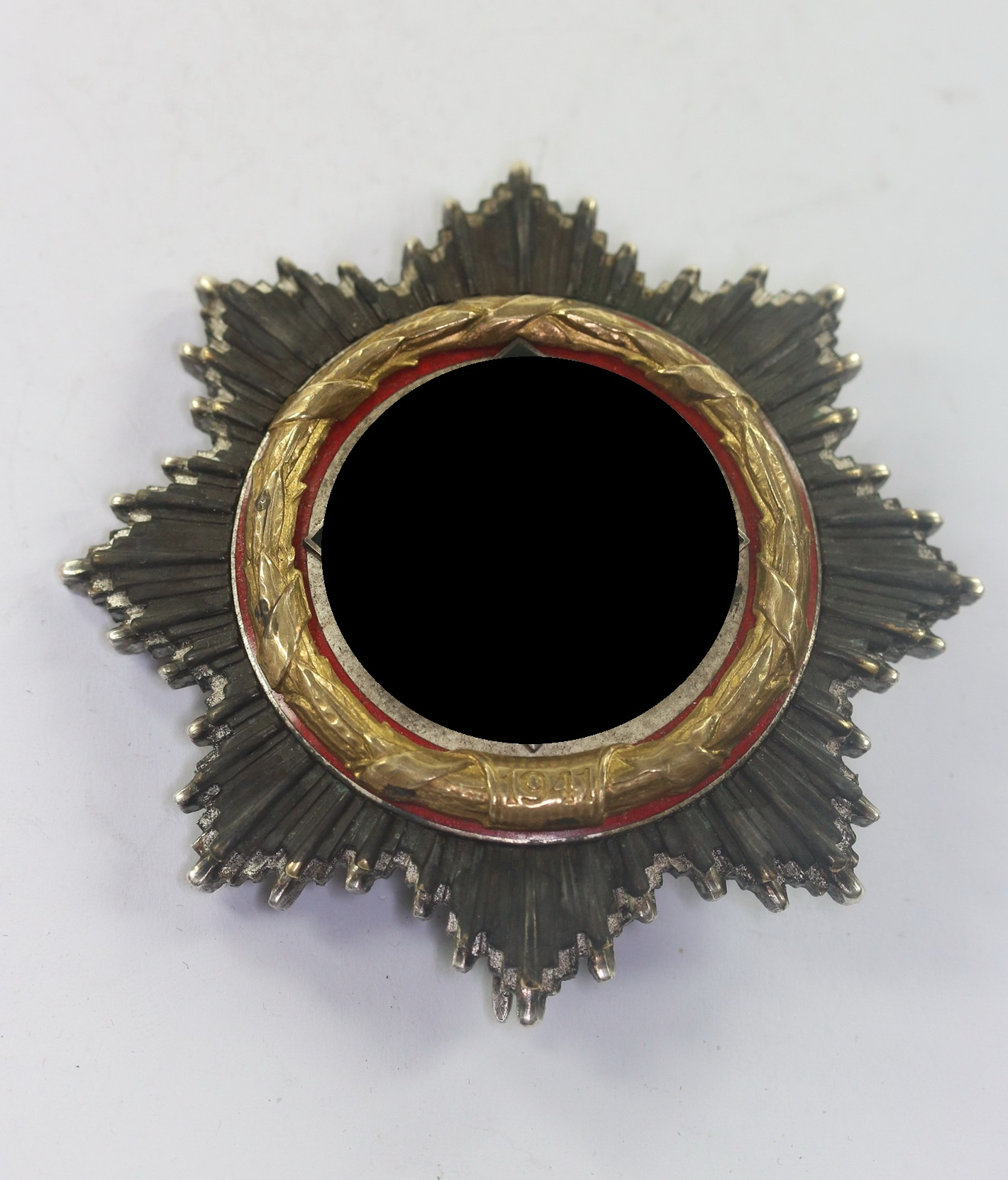 Leichtes Cupal(!) Stück (54,3 g), der Nadelbock zeitgnössisch nachgelötet(!), sonst sehr guter, leicht getragener Zustand. Die Emaille mit minimalen Tragespuren, aber fehlerfrei Der Spiegel mit Patina. Der Lorberkranz mit vollständiger Vergoldung und leichter Patina. Die Strahlenscheibe mit schöner Schwärzung, an den höchsten Stellen etwas berieben. Mit Hersteller „1“ für die Firma Deschler & Sohn, München. Siehe Dietrich März, Das Deutsche Kreuz.