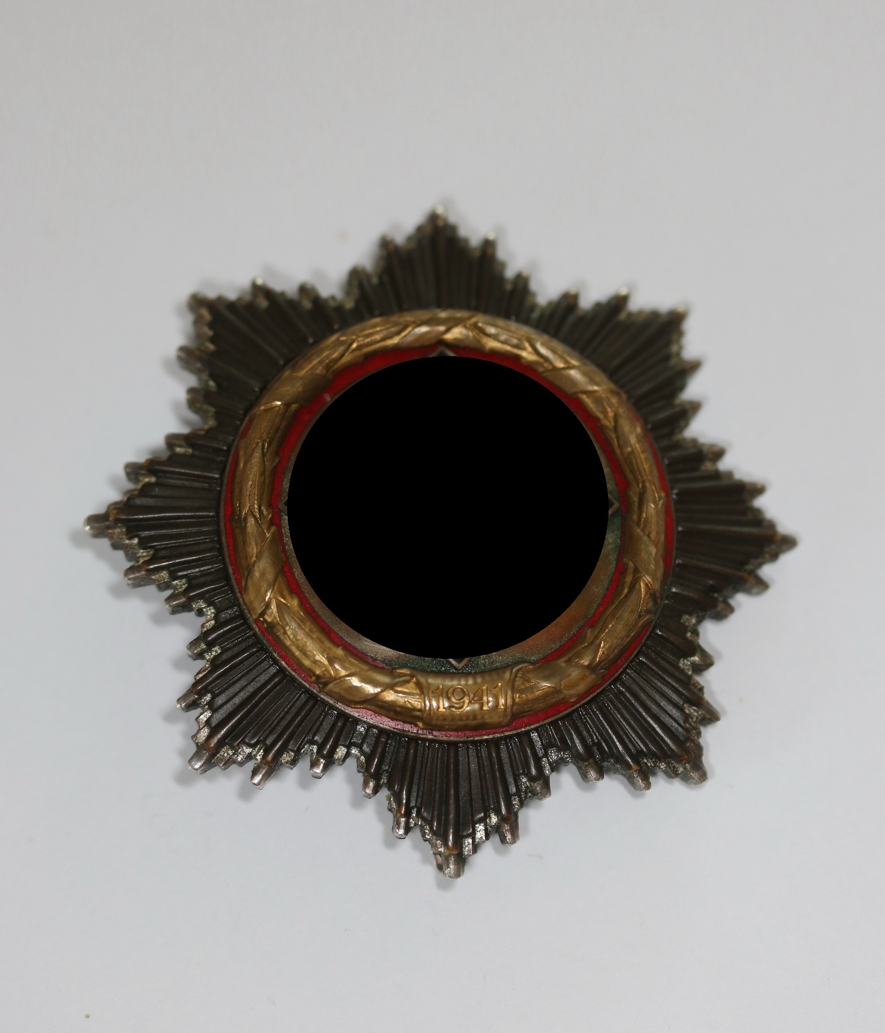 The lightweight (53,1g) piece in a very good, slightly worn condition. The enamel without damage, the mirror with all of the silver plate and an even patina. The laurel wreath with practically all of the gilt plate. The top starburst with all of the dark grey finish. The bottom starburst with all of the silver plate still present and with patina.