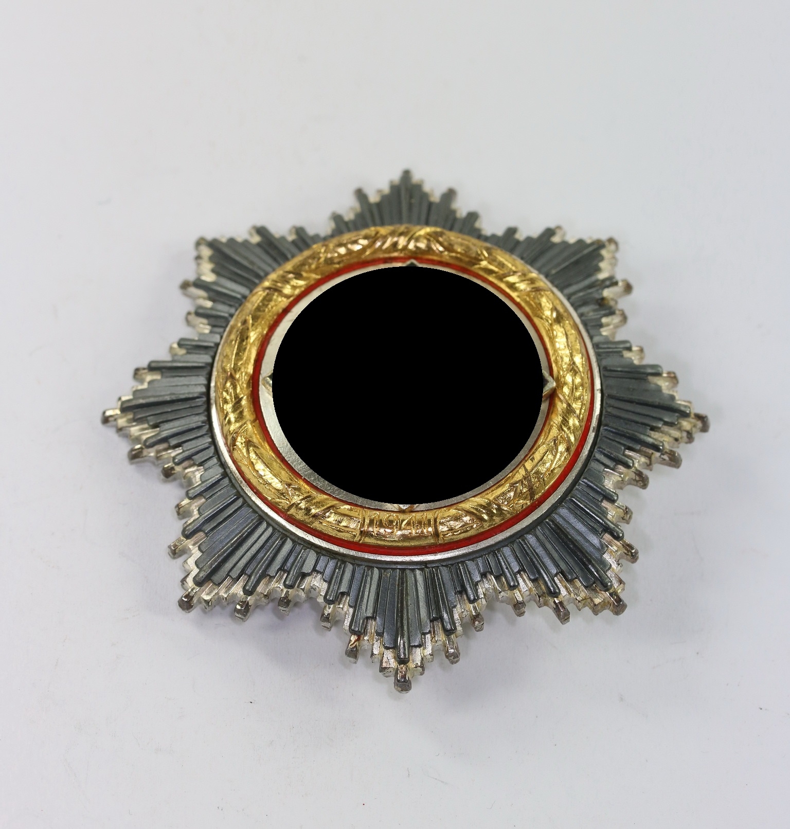 Cupal based (52,9 g) and in a very good, probably unworn condition. The enamel without damage, the mirror with all of the silver plate still present and some patina. The laurel leaf wreath with practically all of the gilt plate.