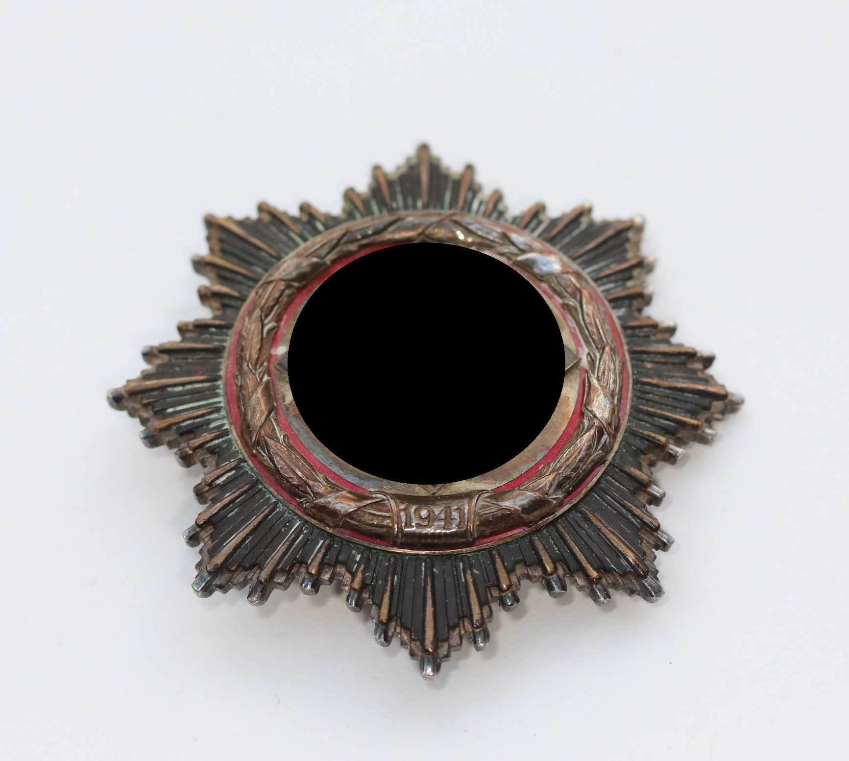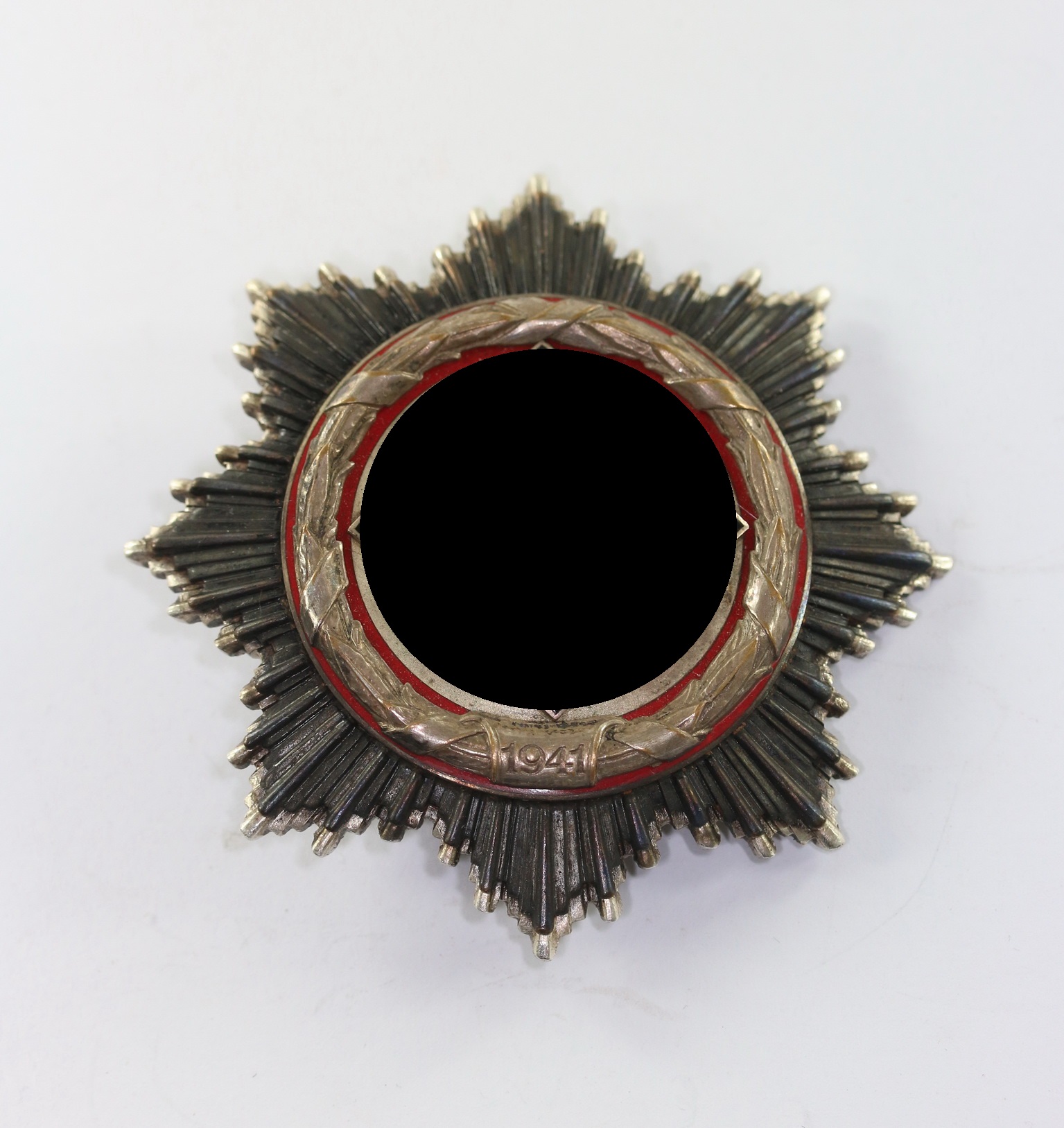 Tombak/brass based, so called heavy type (65,3 g), and in an excellent, probably unworn condition. The enamel without damage. The mirror with all of the beige finish still present. The oakleaf wreath with practically all of the silver plate, the highpoints burnished and with some patina.