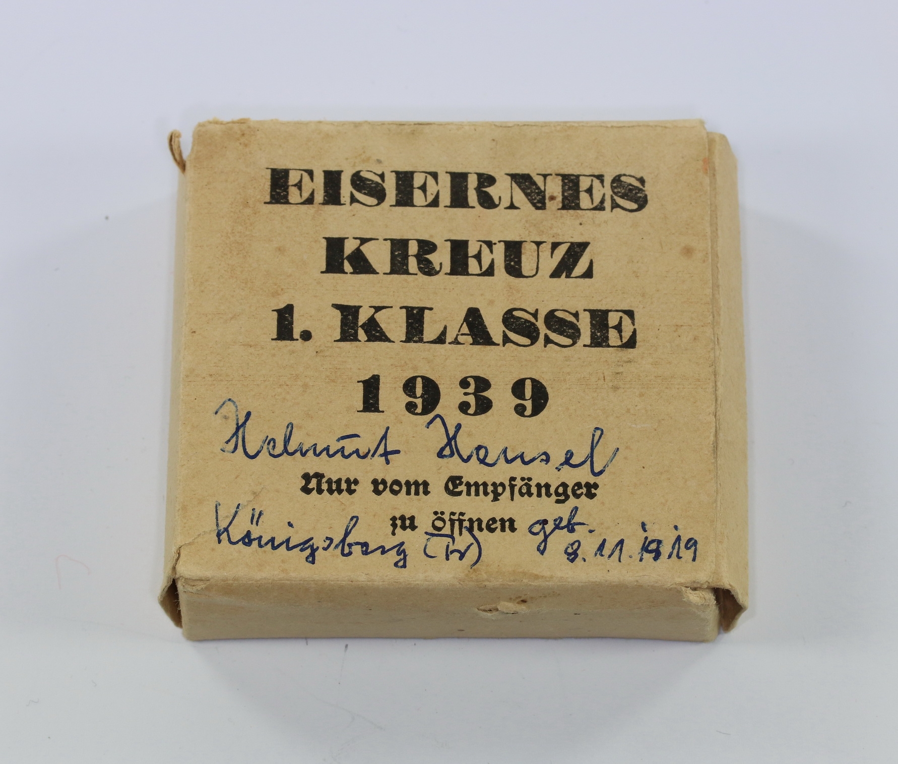 Sehr guter, nur leicht gebrauchter Zustand. Vollständig mit allen Laschen, auch den kleinen Innenlaschen. Auf den Karton der Aufdruck „Eisernes Kreuz 1. Klasse 1939 Nur vom Empfänger zu öffnen“, an der Seite der Hersteller Aufdruck „Paul Meybauer Berlin SW68“ (7).