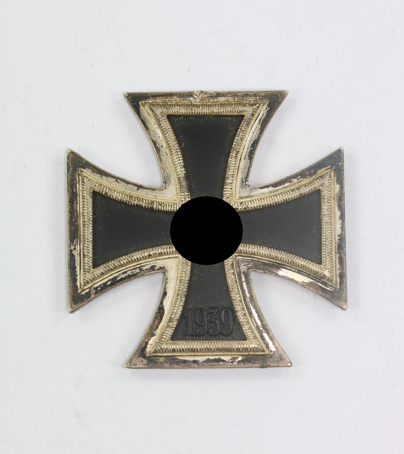 The ribbon ring and eyelet missing(!) otherwise in a very good, slightly worn condition. The core with all of the black paint still present. The ribbing in matt silver, the flanges burnished and all with some patina. Not marked but a known variation. Three piece construction and magnetic.
