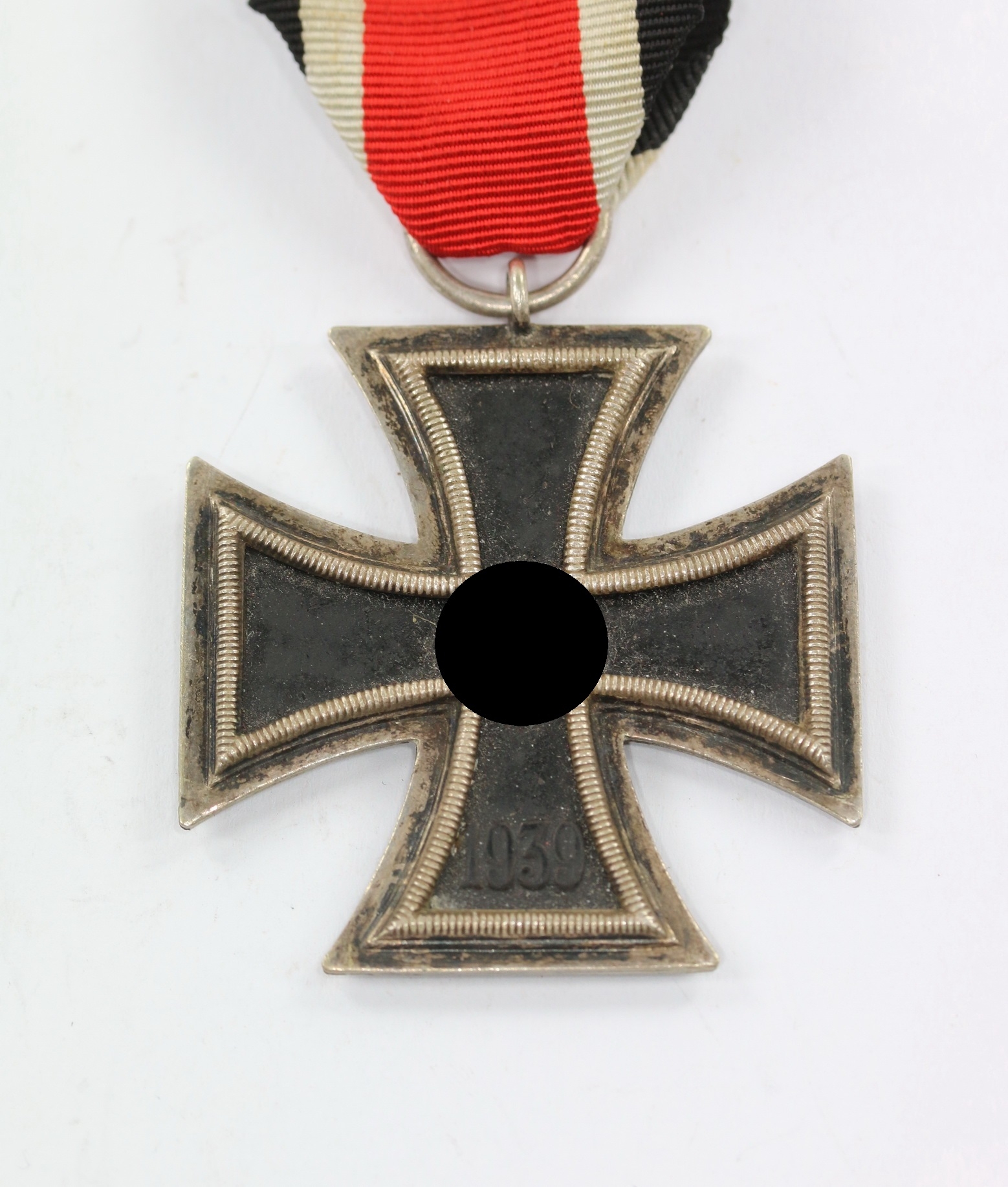 Sehr guter, ungetragener Zustand. Der Kern mit vollständiger Schwärzung, die Zargen frostig, die kanten poliert. Mit minimalen Ansätzen von Patina. Mit Hersteller „44“ für die Firma Jakob Bengel, Idar Oberstein. Magnetisch. Mit ungetragenen Band in voller Verleihungslänge.