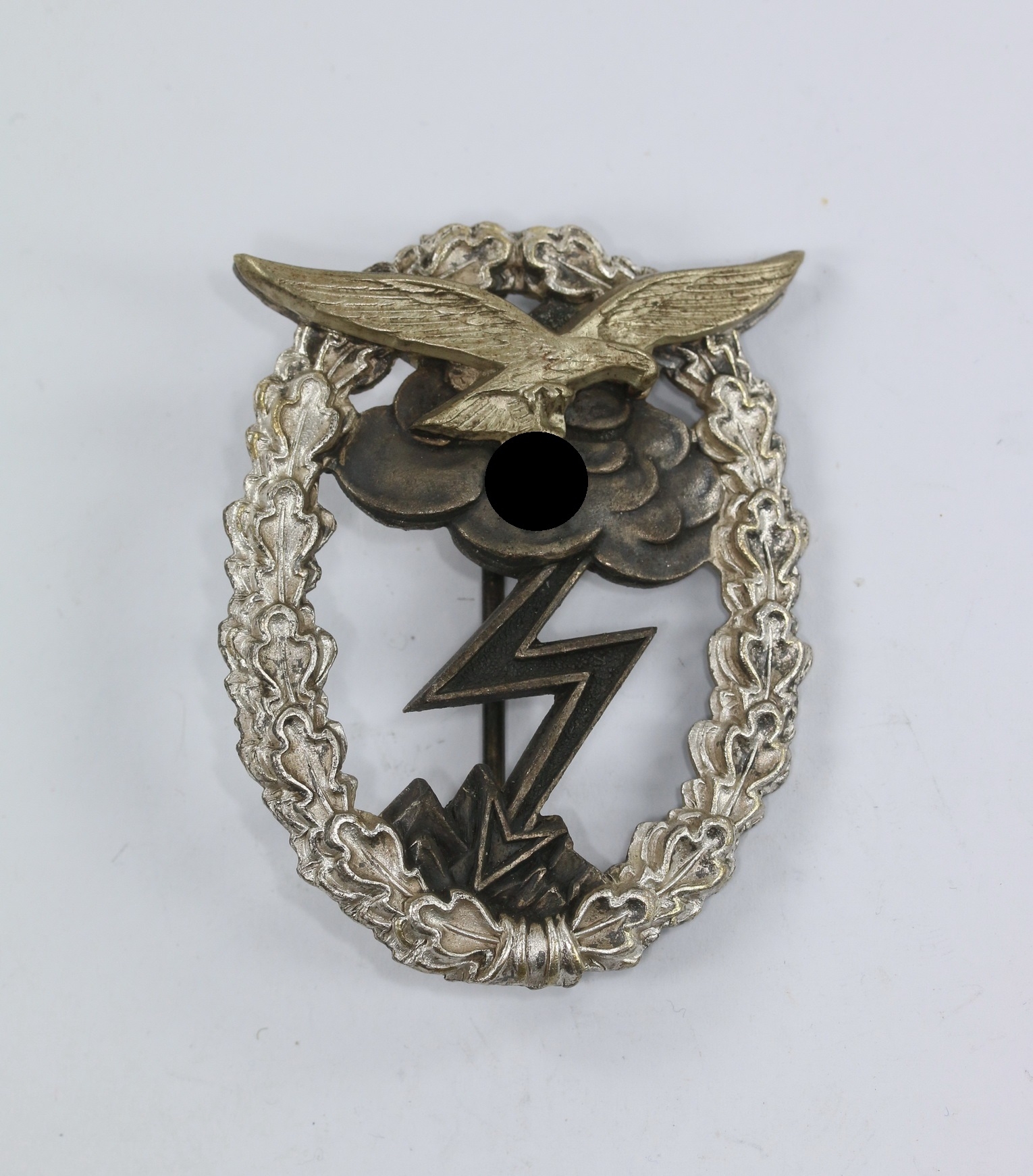 Zinc based and in a very good, probably unworn condition with practically all of the silver plate still present. The clouds and lightning bolt dark oxidised. The tombak basedeagle attached with a single rivet.