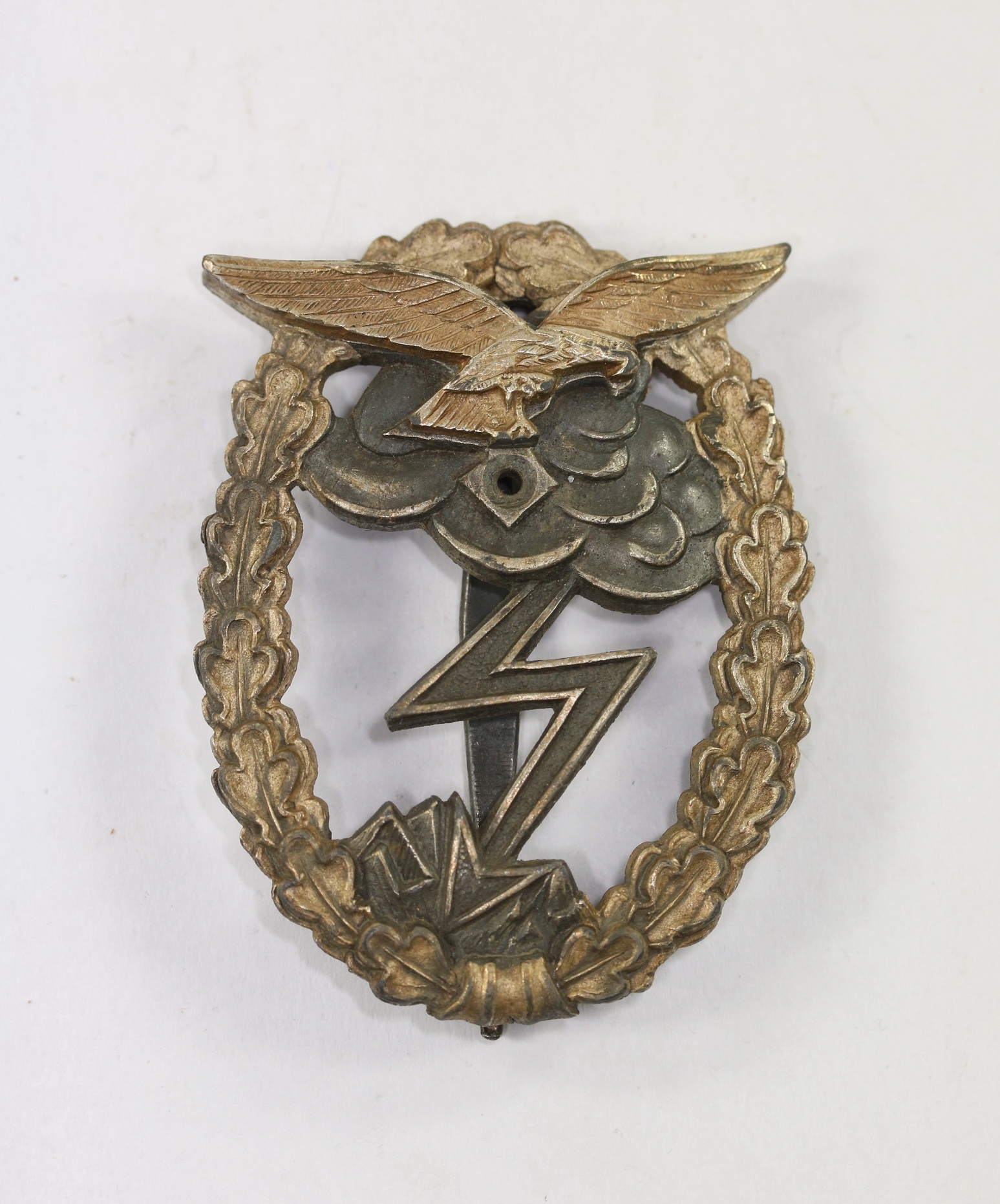 Zink, entnazifiziert(!), sonst sehr guter, nahezu ungetragener Zustand. Der Adler aus versilberten Buntmetall separat aufgesetzt. Mit Hersteller „M.u.K. 5“ für die Arbeitsgemeinschaft Metalle und Kunststoffe. Siehe GCA-Datenbank.