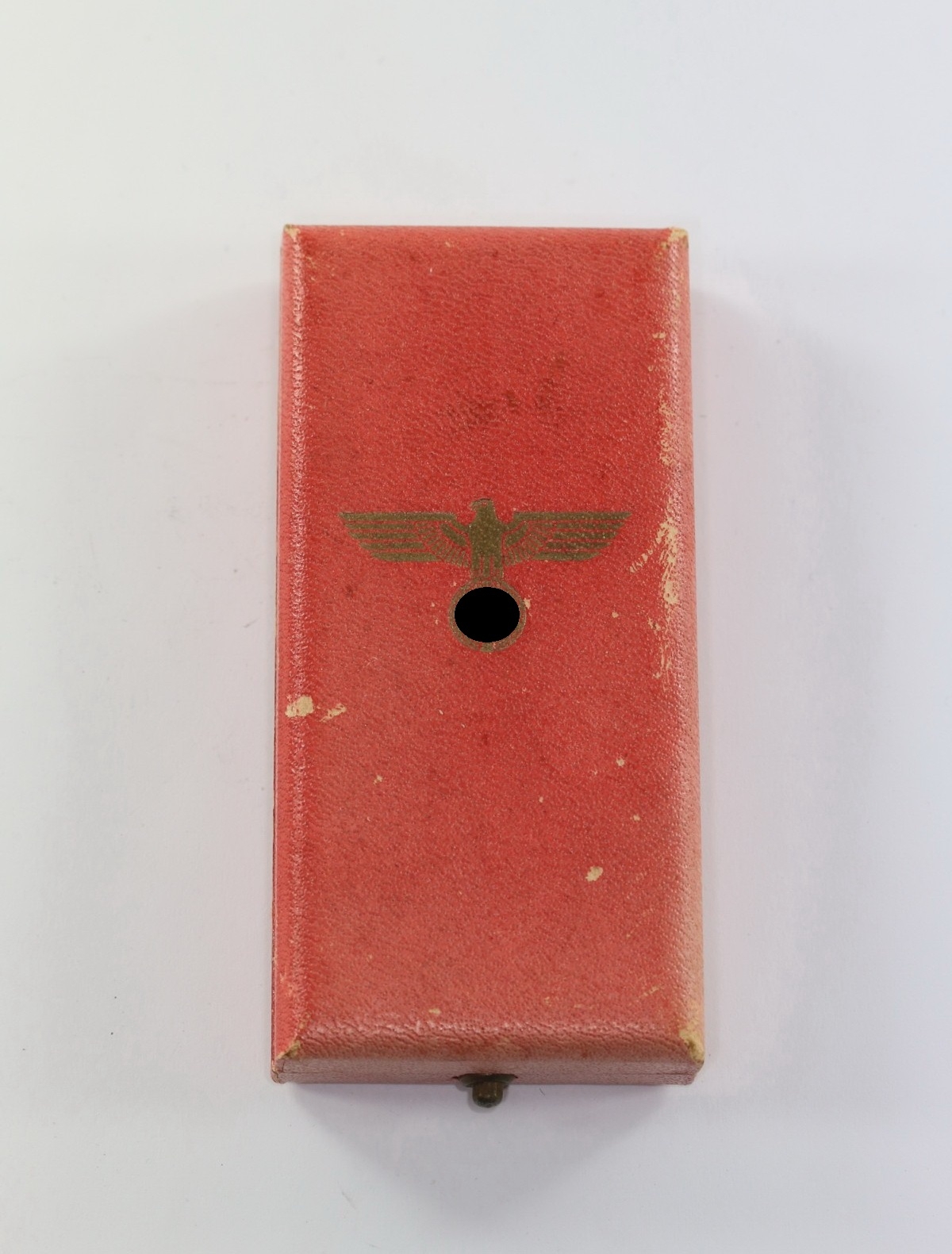 In a good, slightly used condition. The red colour on the lid somewhat faded. Embossed in gold on top of the lid with the Army type eagle.