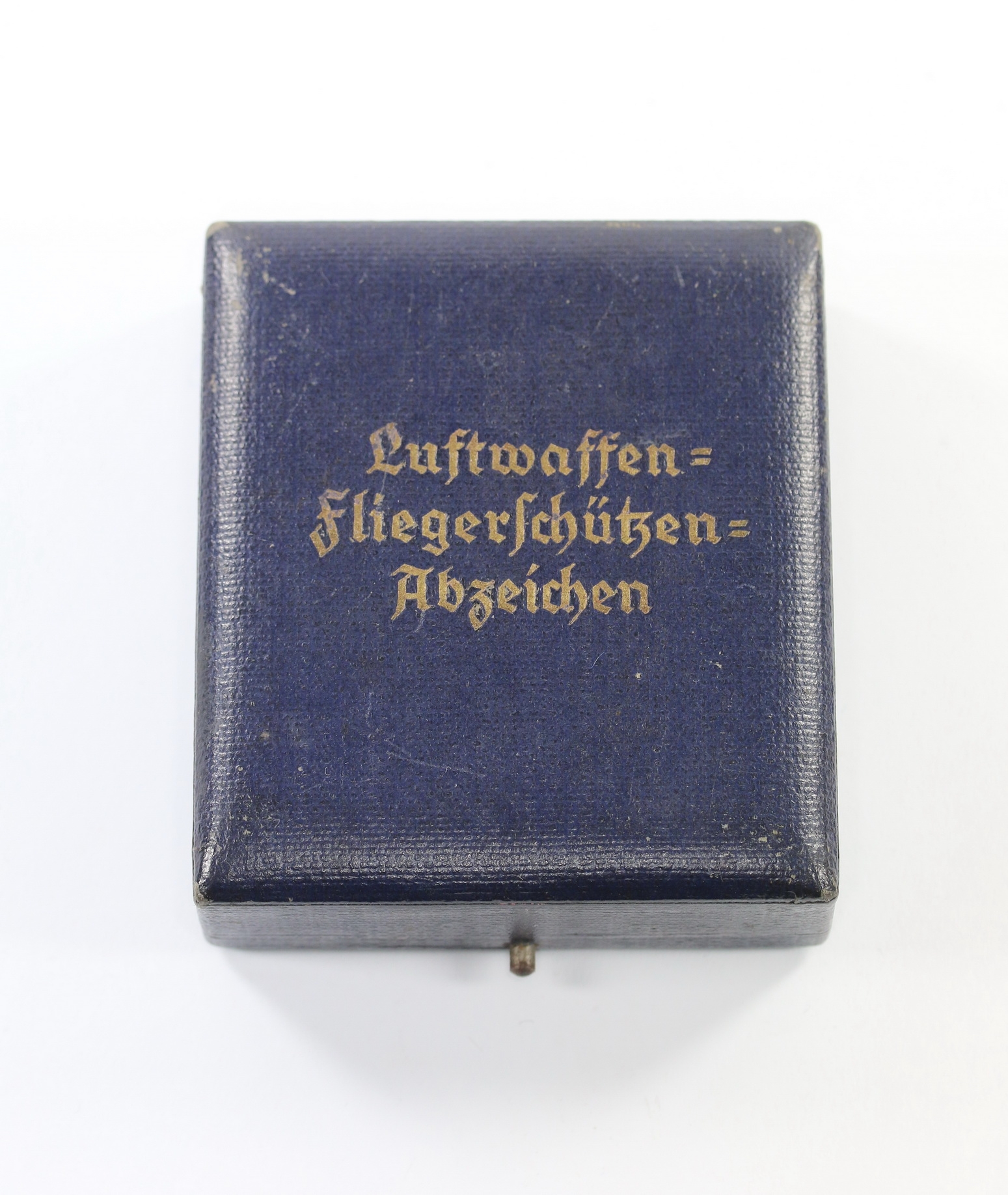 In a very good, slightly used condition. Embossed in gold on top of the lid with the designation „Luftwaffen Fliegerschützenabzeichen“. The inlet covered with blue velvet and the inside of the blue satin.