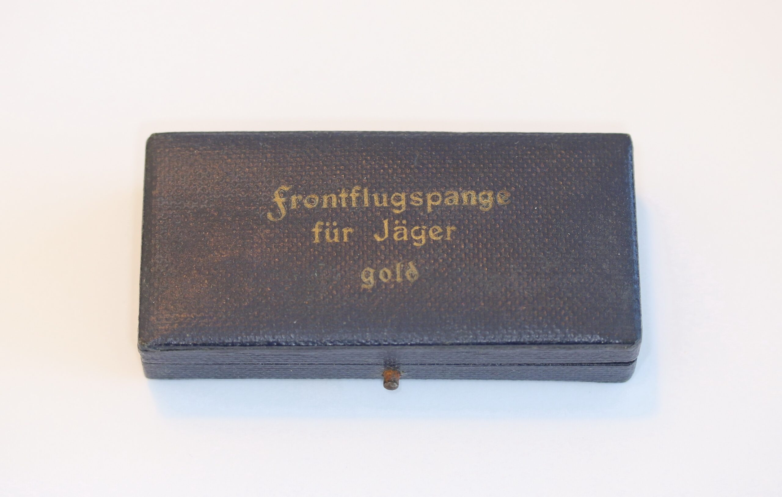 Sehr guter, nur minimal gberauchter Zustand. Auf den Deckel in Gold „Frontflugspange für Jäger gold“. Frühes Etui für Buntmetallspangen.