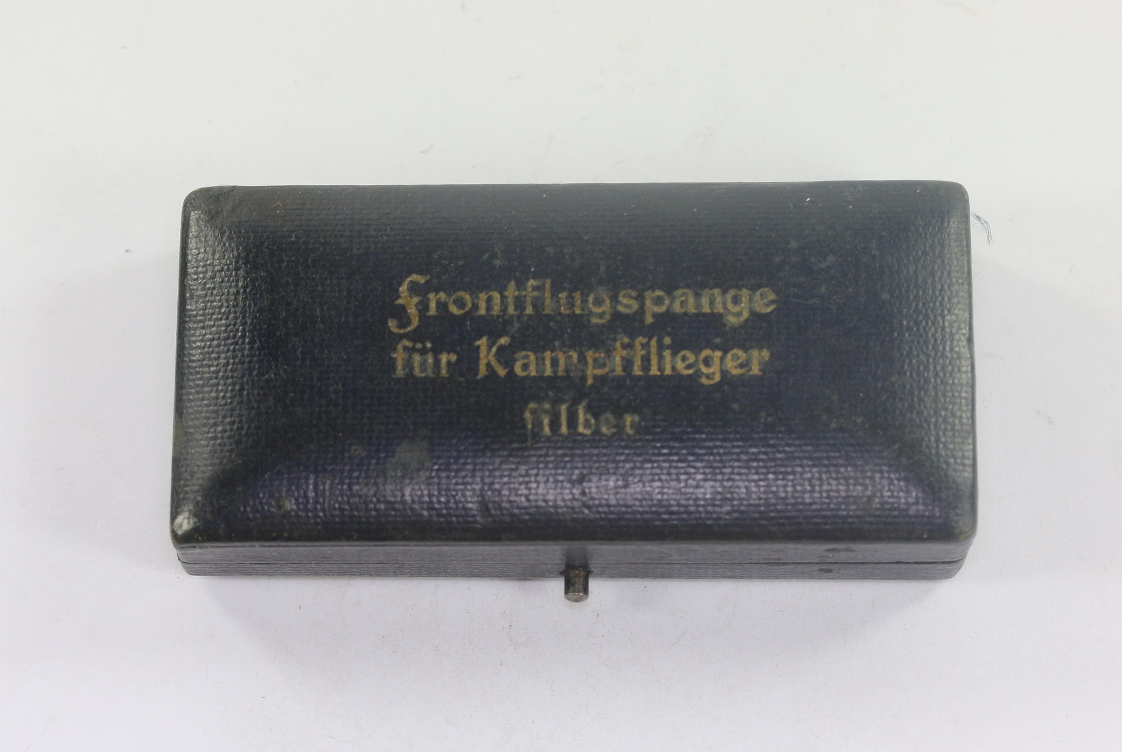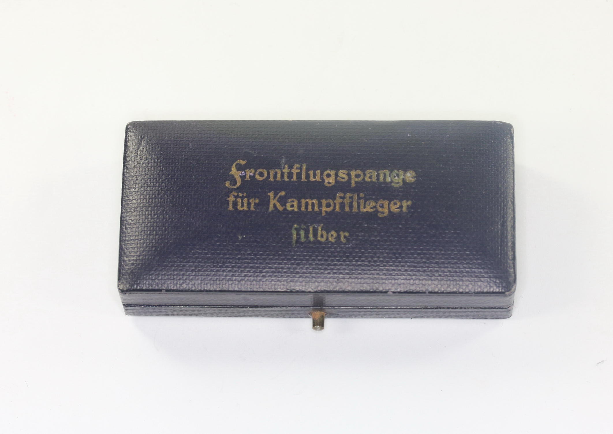 In a very good, slightly used condition. Embossed in gold on top of the lid with the designation „Frontflugspange für Kampfflieger silber“. The inlet covered with beige material and the inside of the lid with white satin.