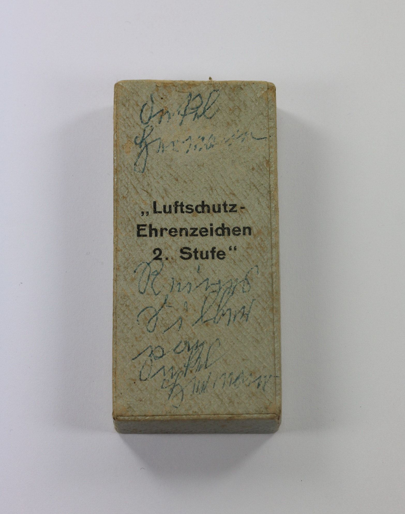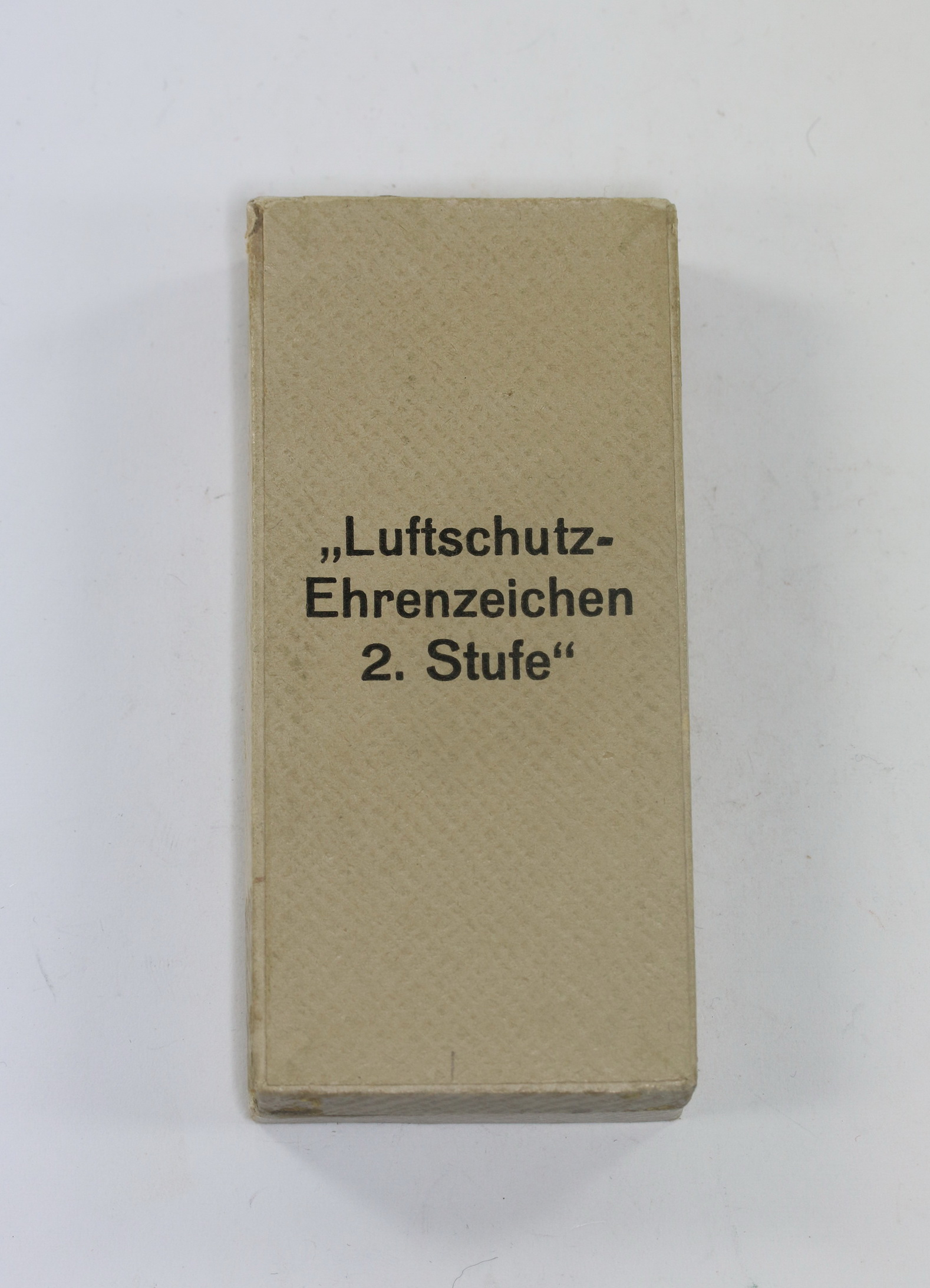 Printed on the lid with the designation „Luftschutz-Ehrenzeichen 2. Stufe“. Fitting for both heavy and light patterns. Size approx. 100 x 45 x 15 mm.
