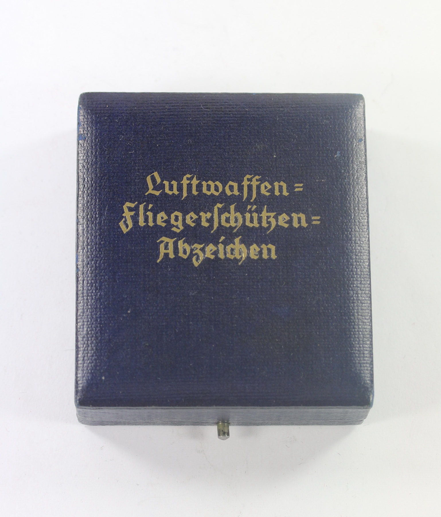 In an excellent, nearly like new condition. Embossed in gold on top of the lid with the designation „Luftwaffen Fliegerschützen Abzeichen“. The inlet covered with blue velvet and the inside of the lid with blue satin.