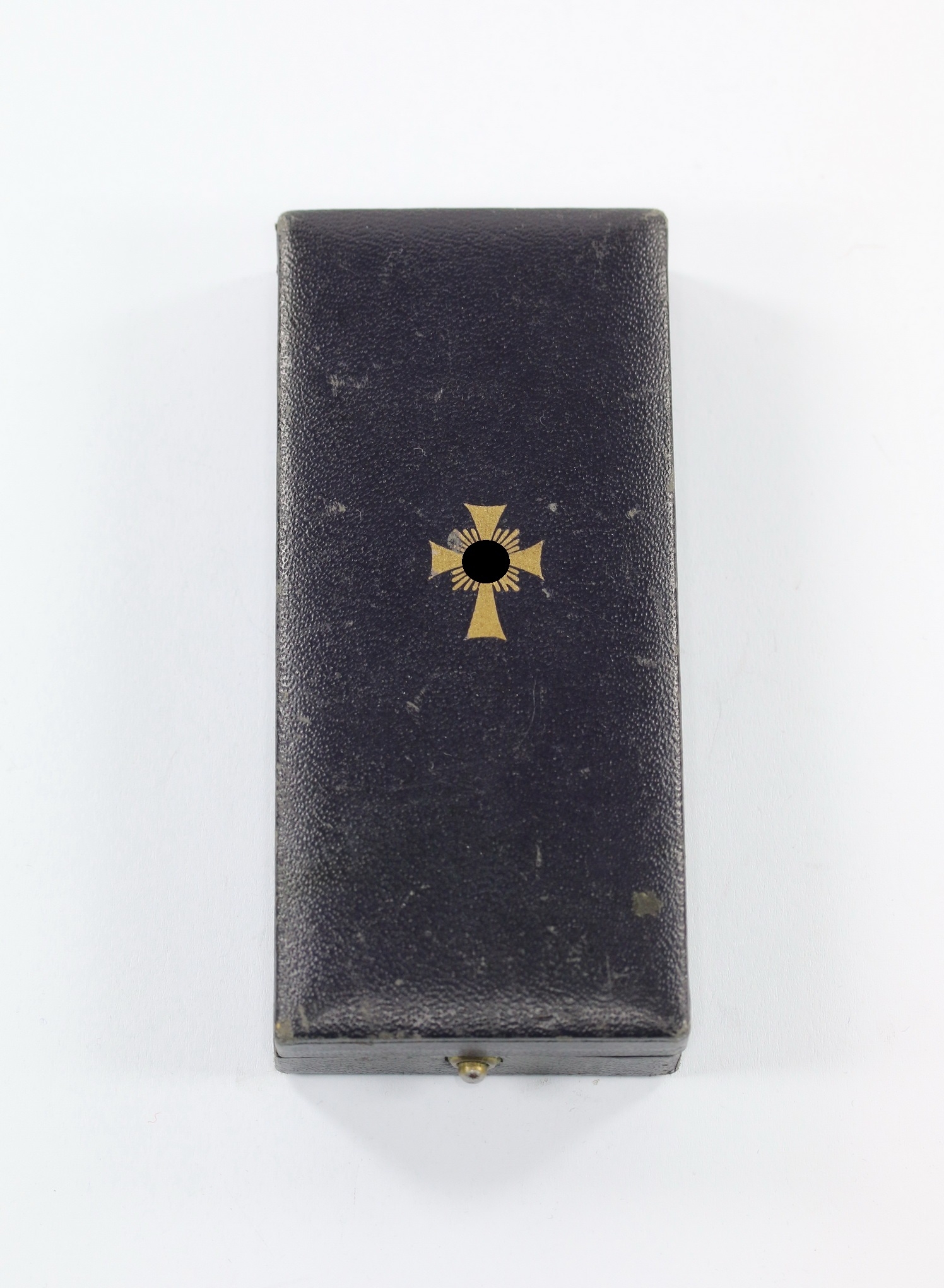 In a very good, slightlyused condition. Embossed in gold on top of the lid with an image of the cross and printed on the white satin inside of the lid with the maker „C. E. Juncker, Berlin“.