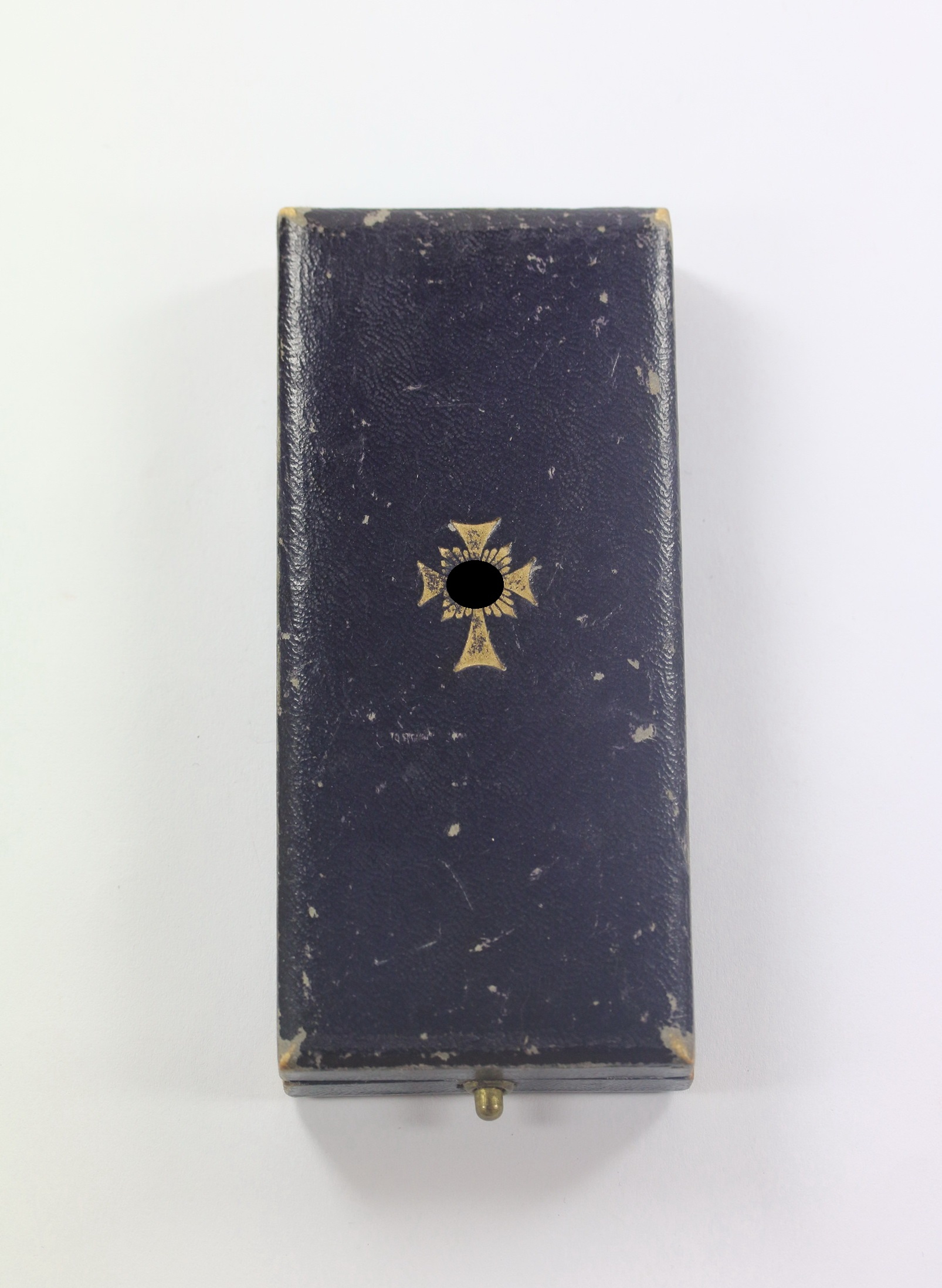 Sehr guter, leicht gebrauchter Zustand. Auf den Deckel mit Abbildung der Auszeichnung mit Hakenkreuz. Im Deckel der Hersteller Stempel „Werner Redo, Saarlautern“.