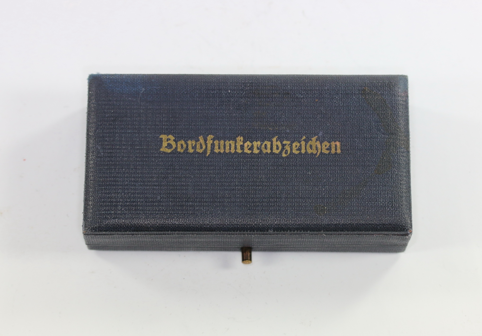 In a very good, slightly used condition. Covered with the typical, early type cloth material and gold embossed with the designation „Bordfunkerabzzeichen“. The inlet covered with blue velvet and the inside of the lid with blue satin.