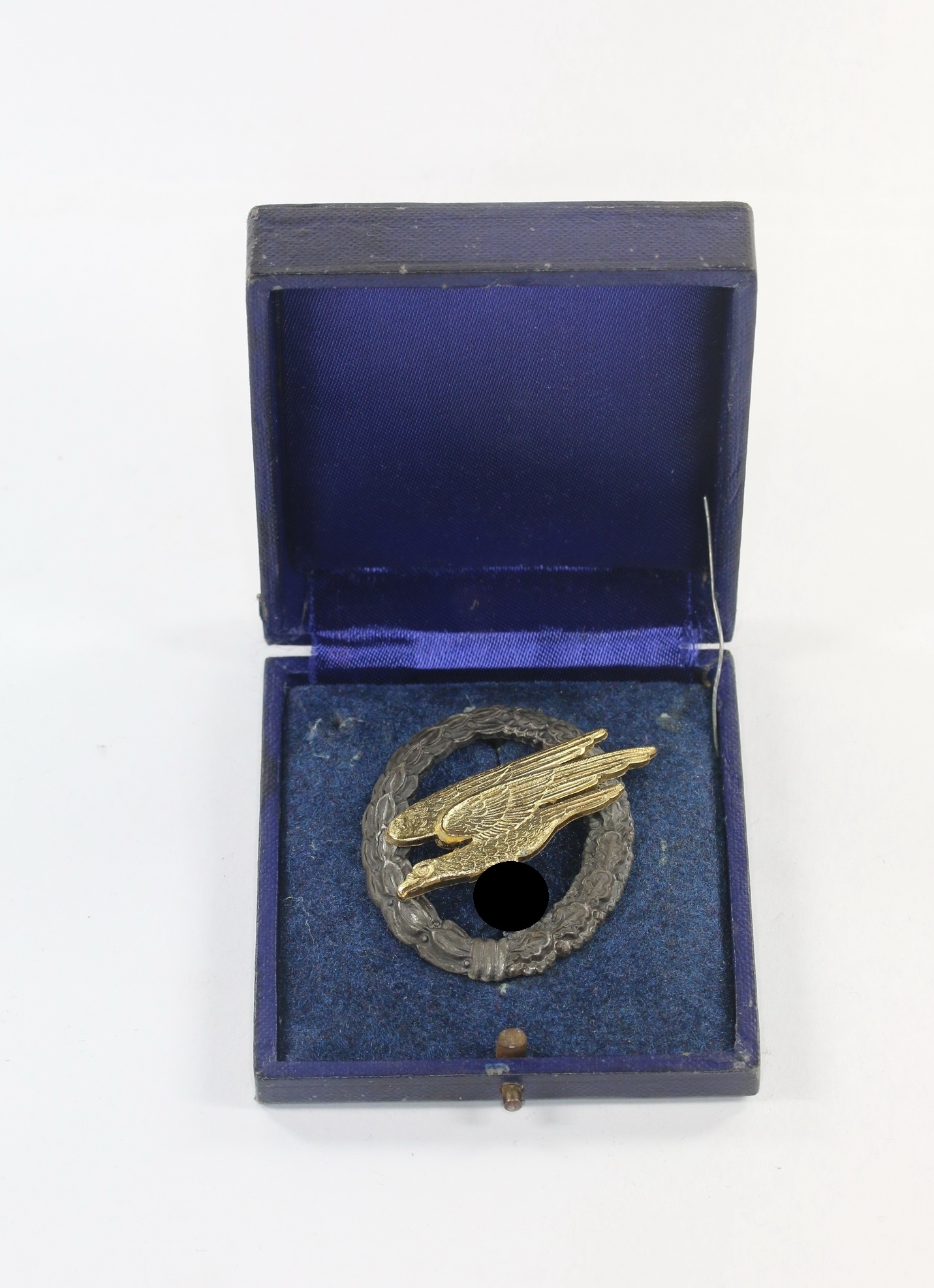 Cased Luftwaffe Paratrooper Badge. Maker A.