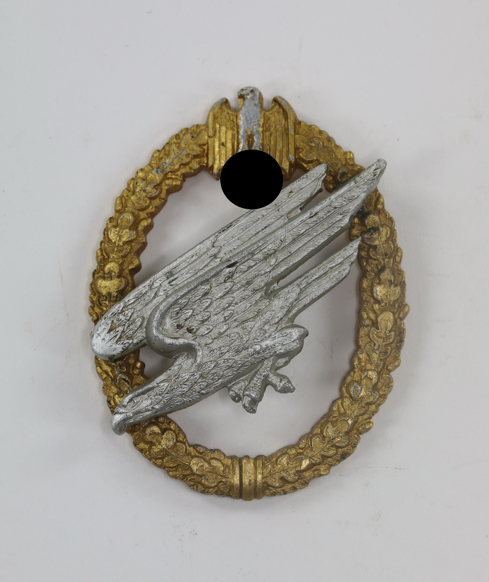 Aluminium, der Adler neu verlötet(!), die Nieten fehlen(!). das Nadelsystem vollständig entfernt(!), sonst sehr guter, leicht getragener Zustand. Der Kranz mit fast vollständiger Vergoldung, der stürzende Adler mit vollständiger Versilberung. Ohne Hersteller, aber eine bekannte Variante der Firma C.E. Juncker, Berlin. Siehe GCA-Datenbank.