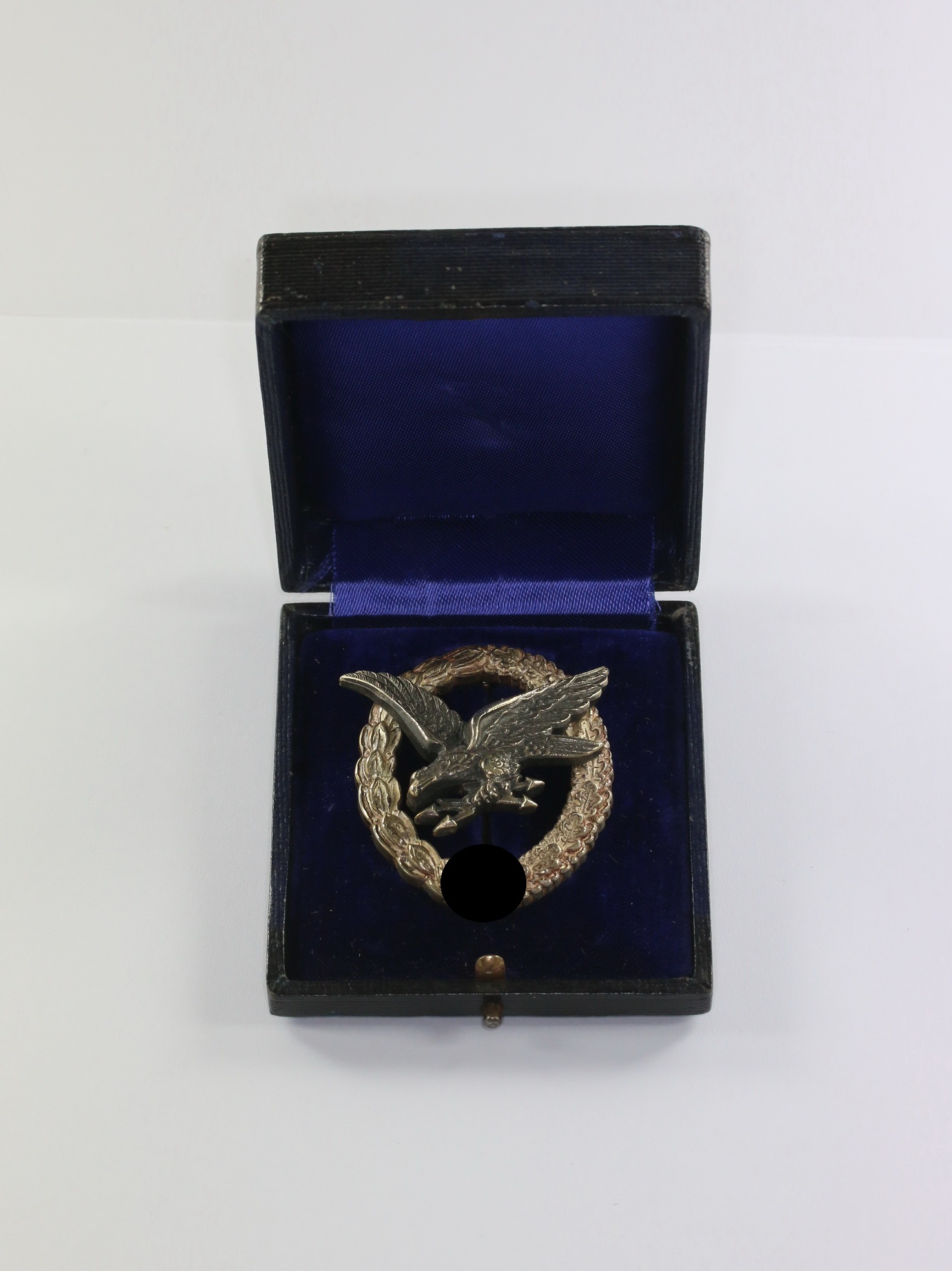 Im zugehörigen Etui. Das Etui in einen sehr guten, leicht gebrauchten Zustand. Auf den Deckel in Gold eingeprägt „Luftwaffen Fliegerschützenabzeichen“. Innen mit Samt und Seide.