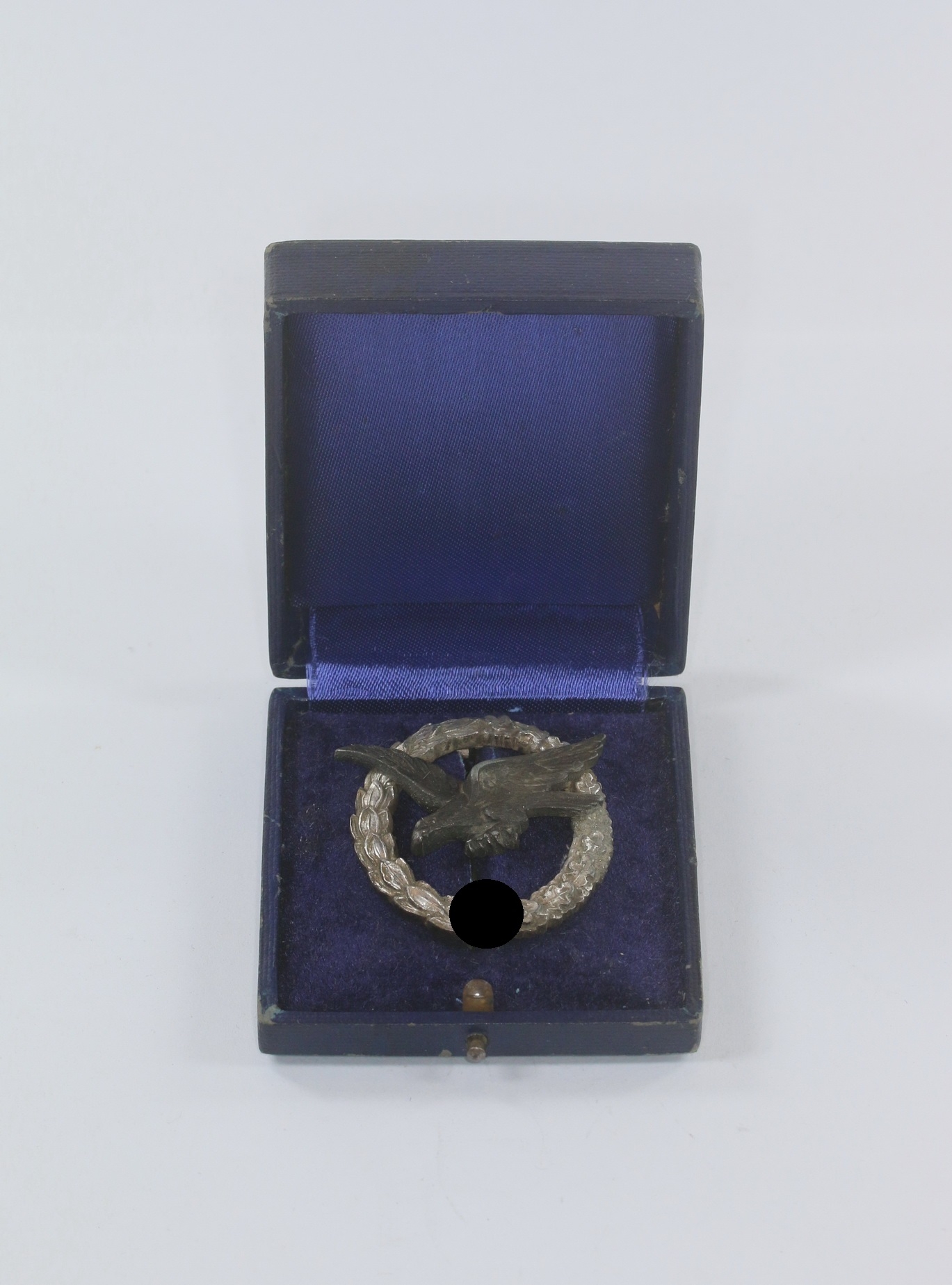 The fitting case in a good, somewhat used condition with some signs of use and age. Embossed in gold on top of the lid with the designation „Luftwaffen Fliegerschützen Abzeichen“. The inlet covered with blue sprayed felt and the inside of the lid with blue satin.