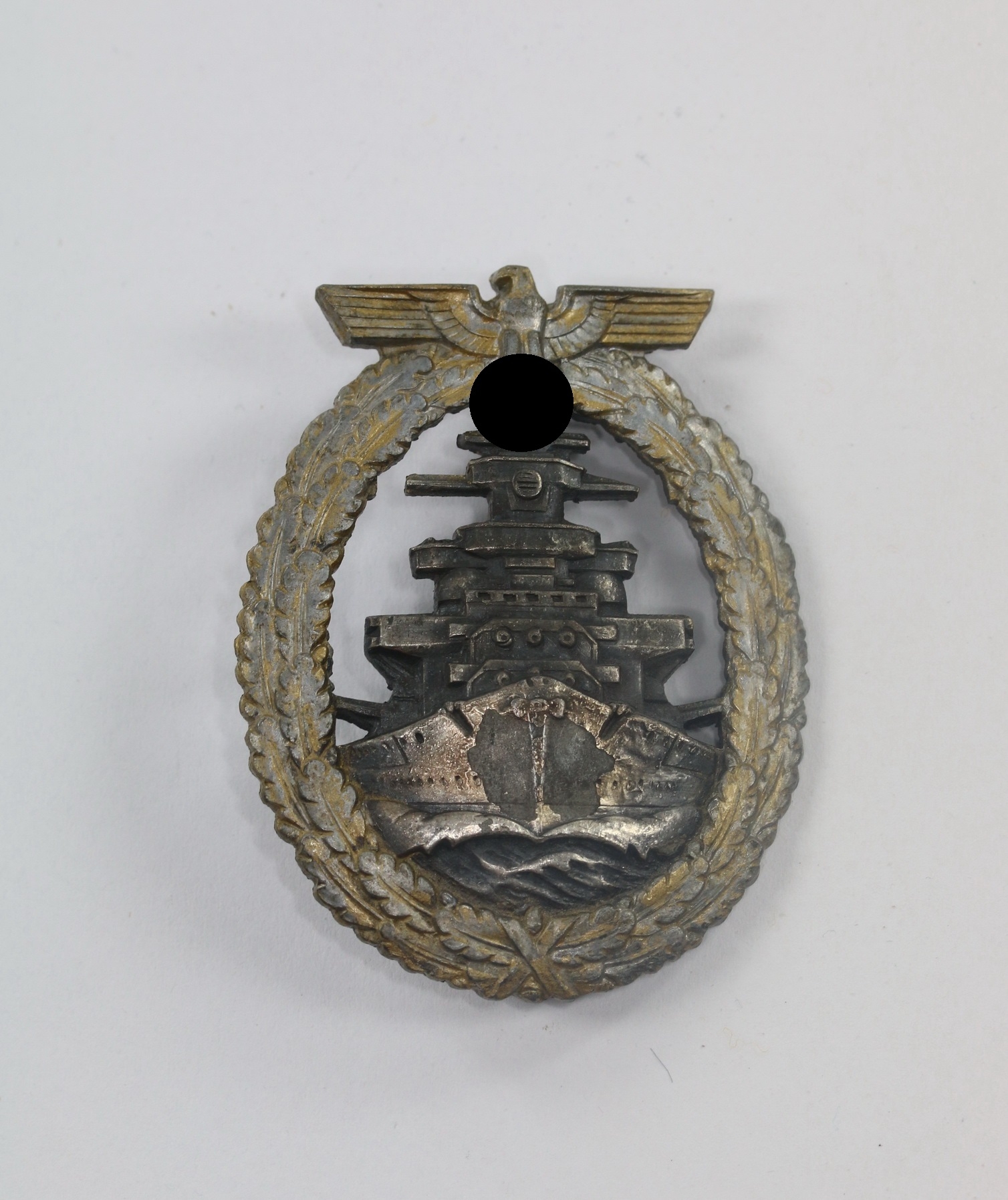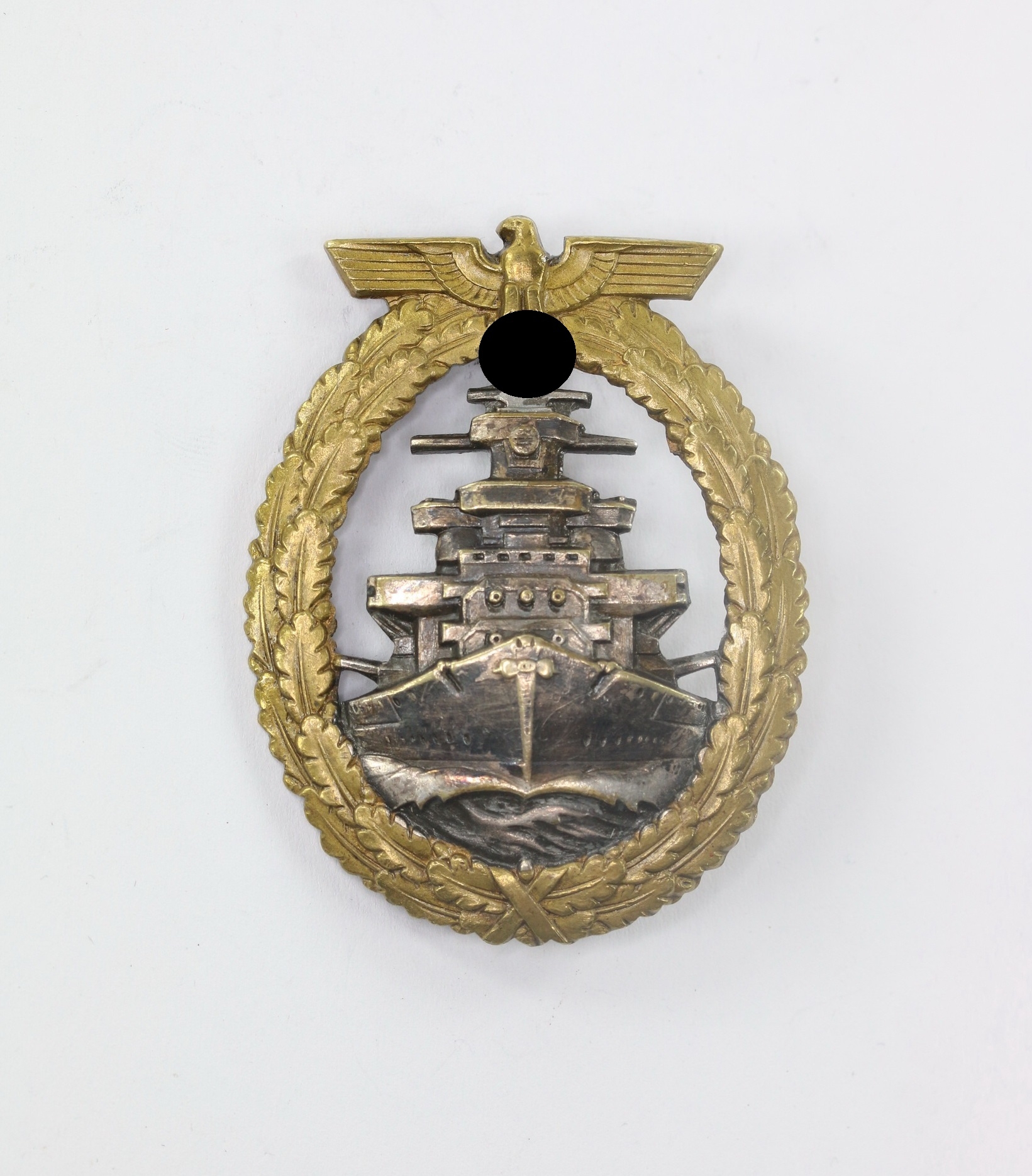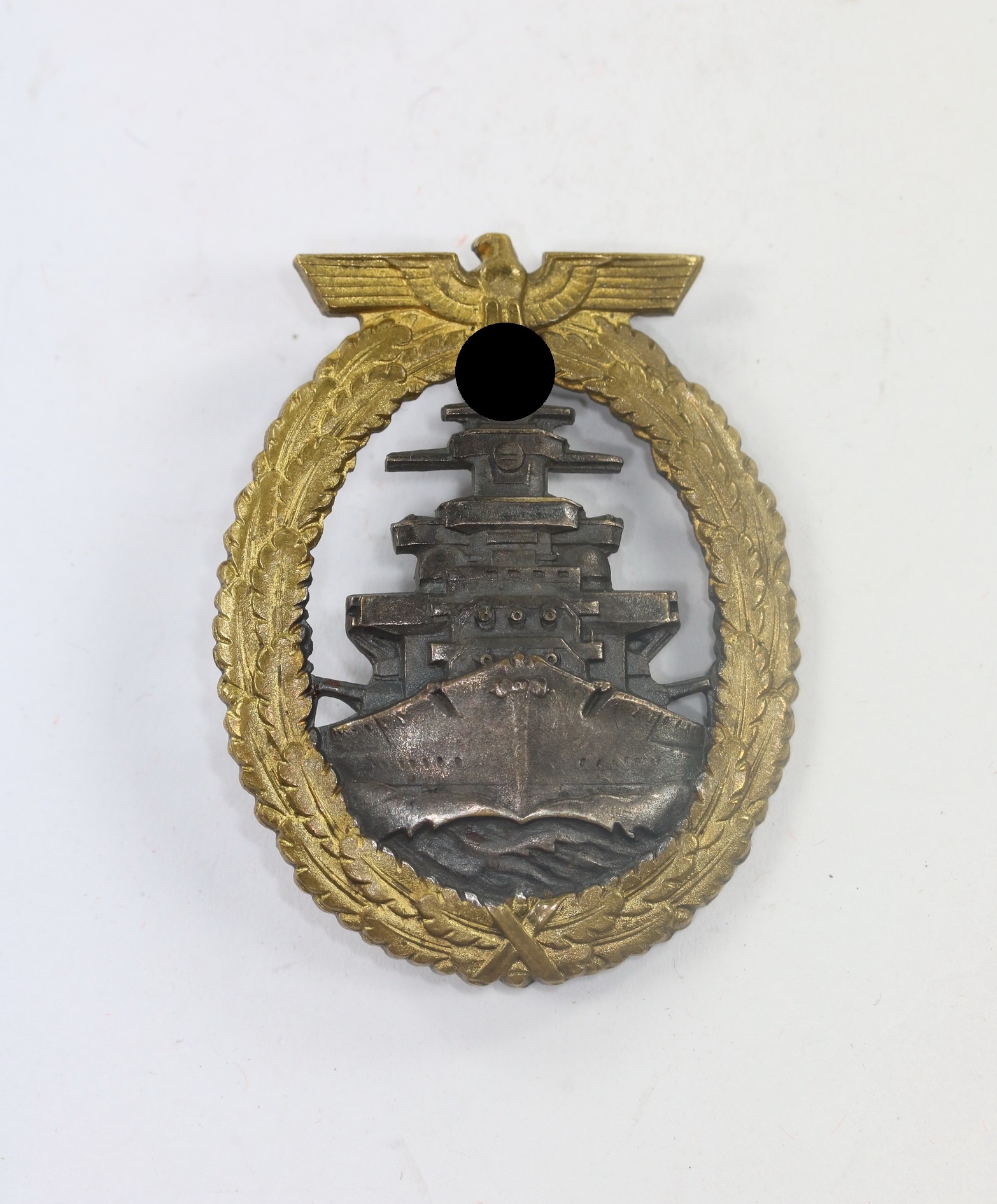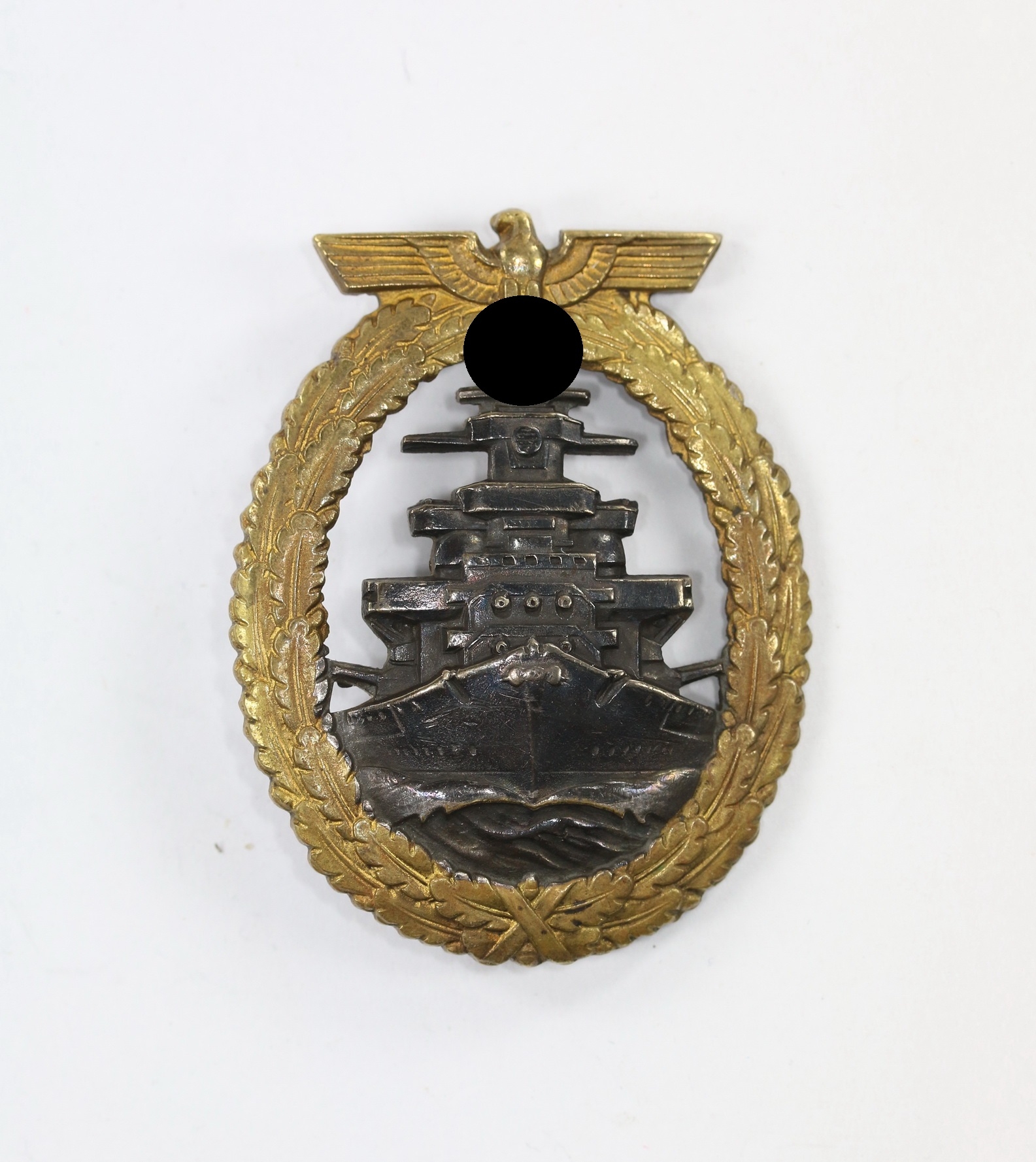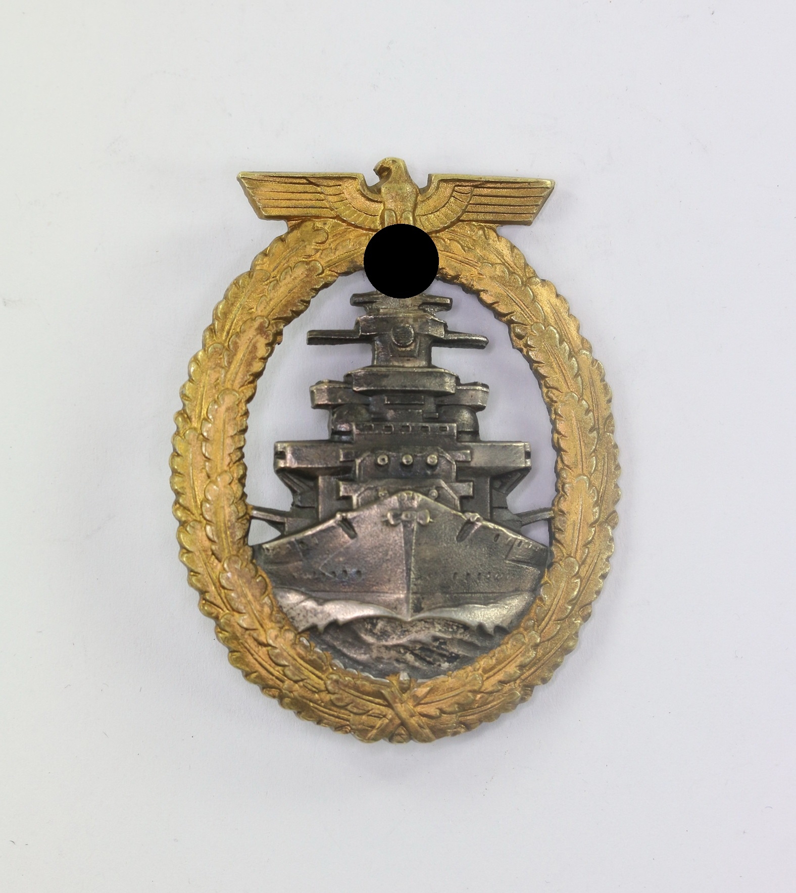 Tombak/brass based and in a very good, slightly worn condition. The wreath with most of the gilt plate. The ship with nearly all of the dark oxidised finish. Early pattern badge with all 5 bridge windows.