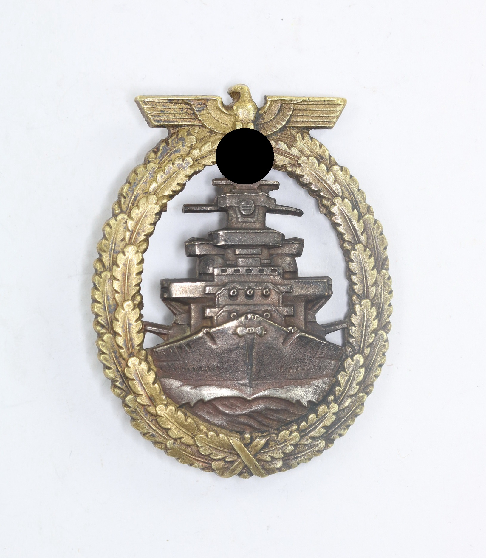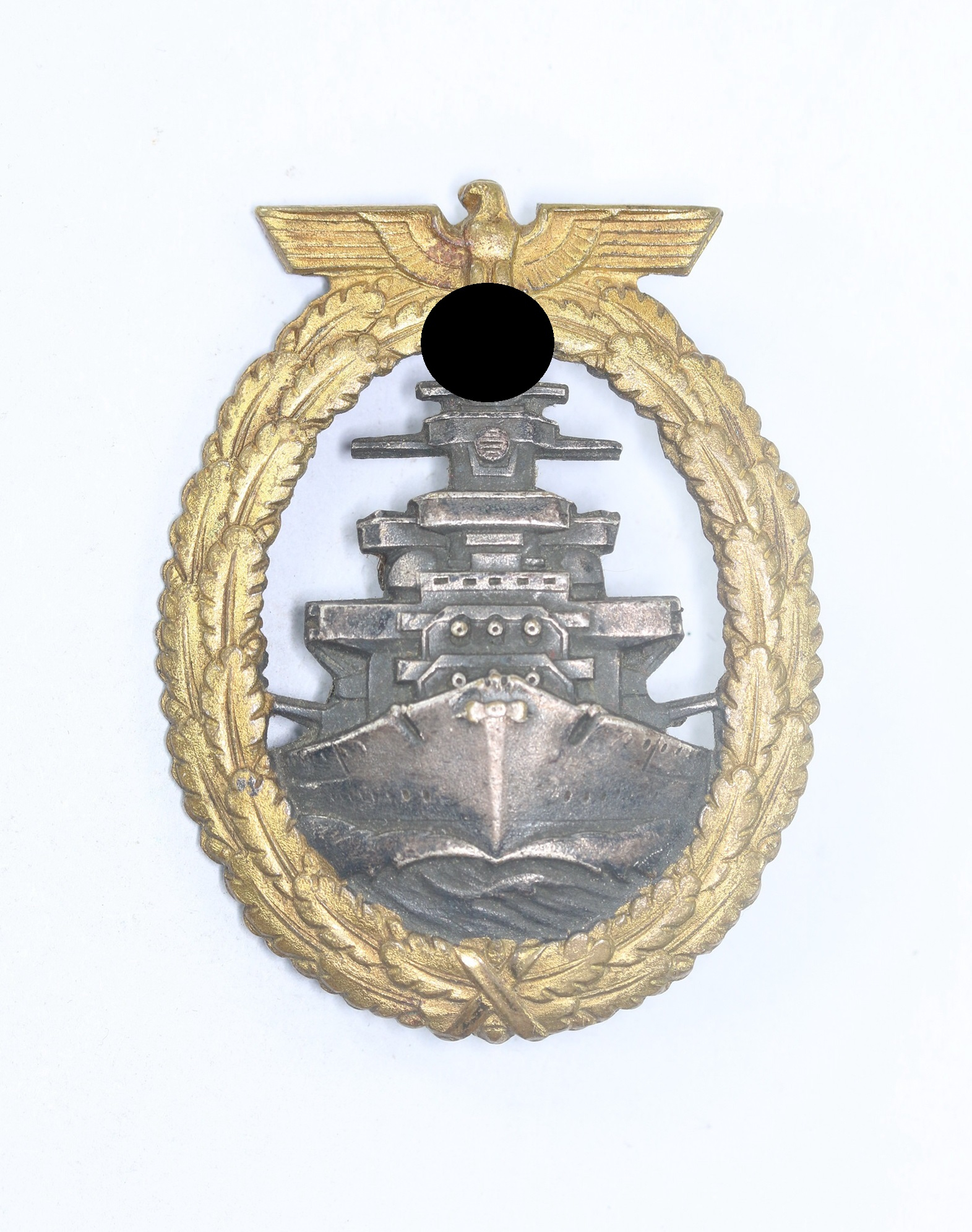 Buntmetall, sehr guter, leicht getragener Zustand. Der Kranz mit noch sehr schöner Vergoldung. Das Schiff mit fast vollständiger Tönung. Mit leichter Patina. Mit Hersteller „Schwerin Berlin“, siehe Weber/Skora, Die Kriegsabzeichen der Kriegsmarine. Frühes Abzeichen mit noch allen fünf Frücken Fenstern.