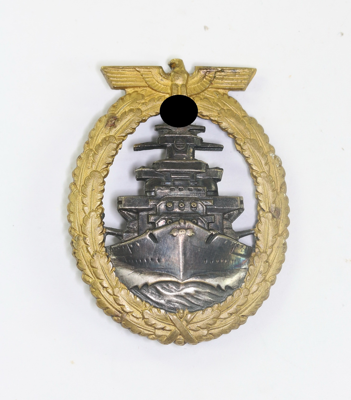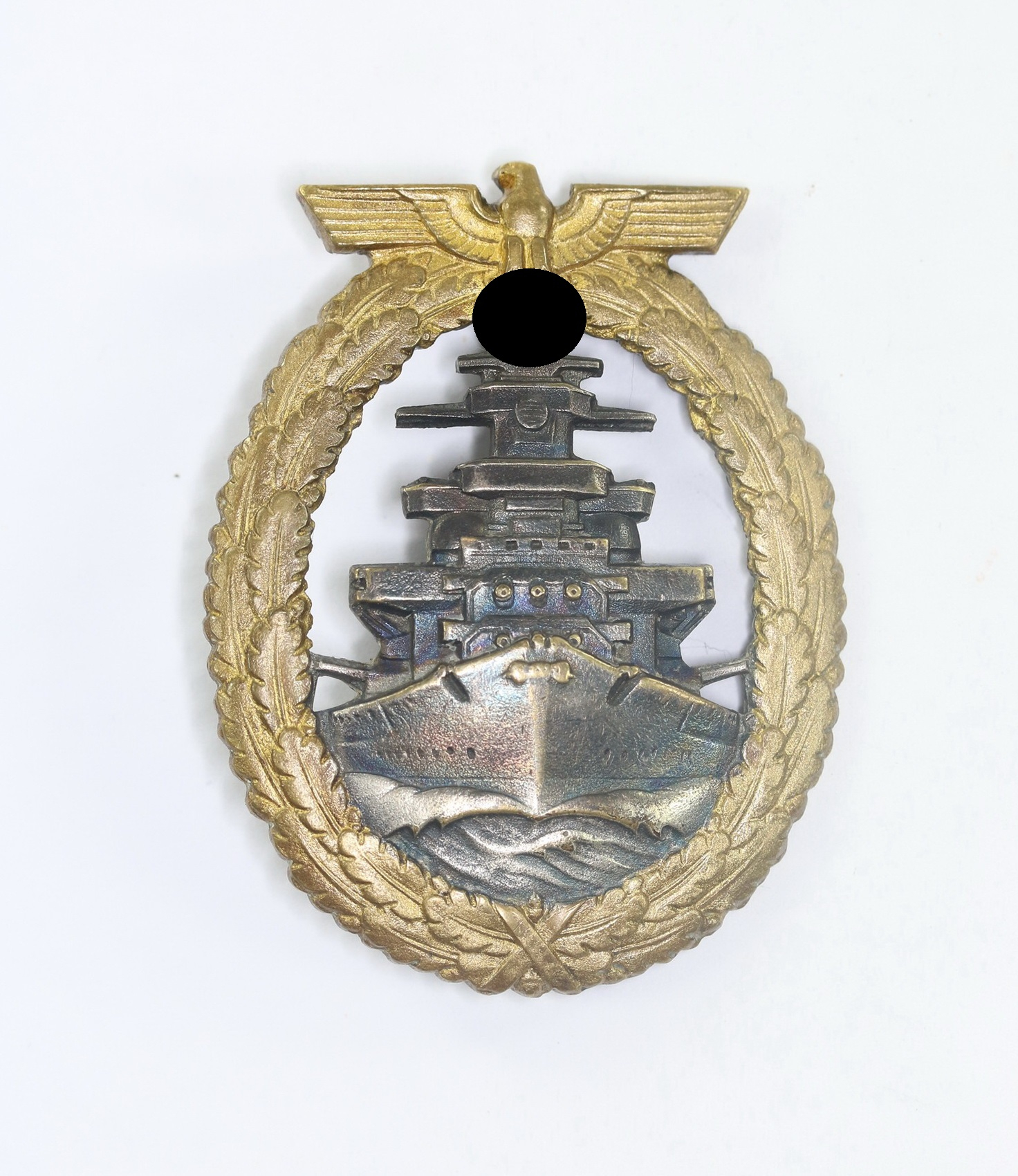 Zink, sehr guter, leicht getragener Zustand. Der Kranz mit noch schöner Vergoldung, das Schiff mit fast vollständiger Tönung. Mit Hersteller „Schwerin Berlin“. Siehe Weber/Skora, Die Kriegsabzeichen der Kriegsmarine.