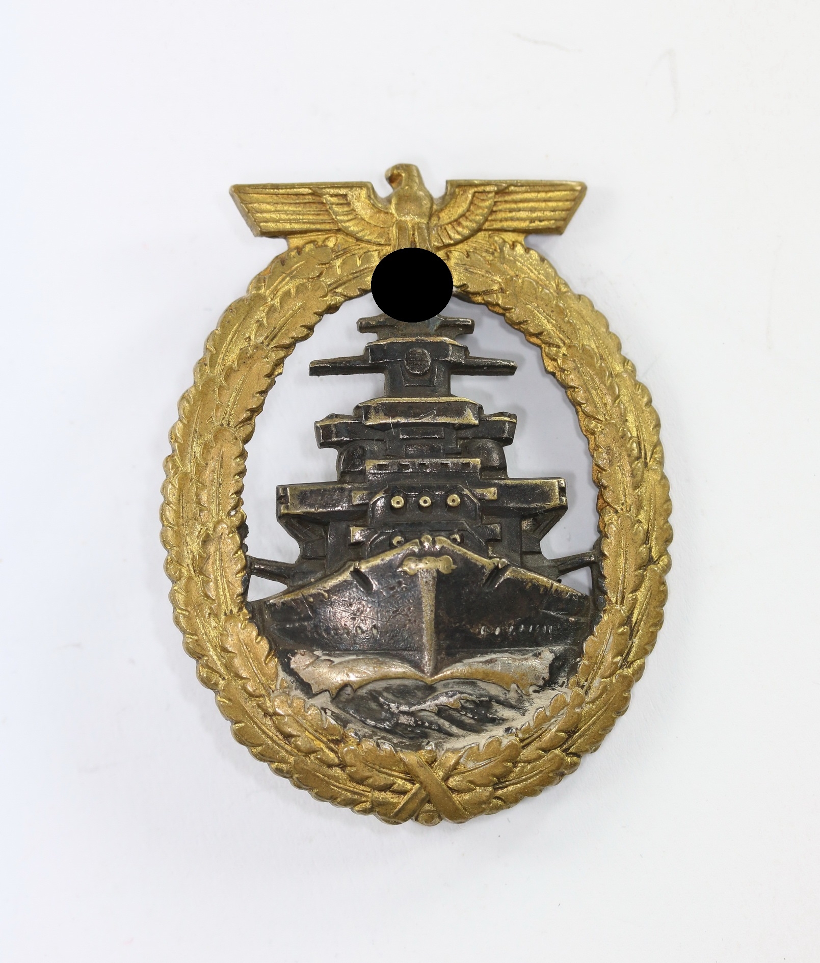Marked on the reverse with the maker „Schwerin Berlin“, see Weber/Skora The War Badges of the Kriegsmarine. Early pattern badge with all five bridge windows and sharp profile of the bow to the reverse.