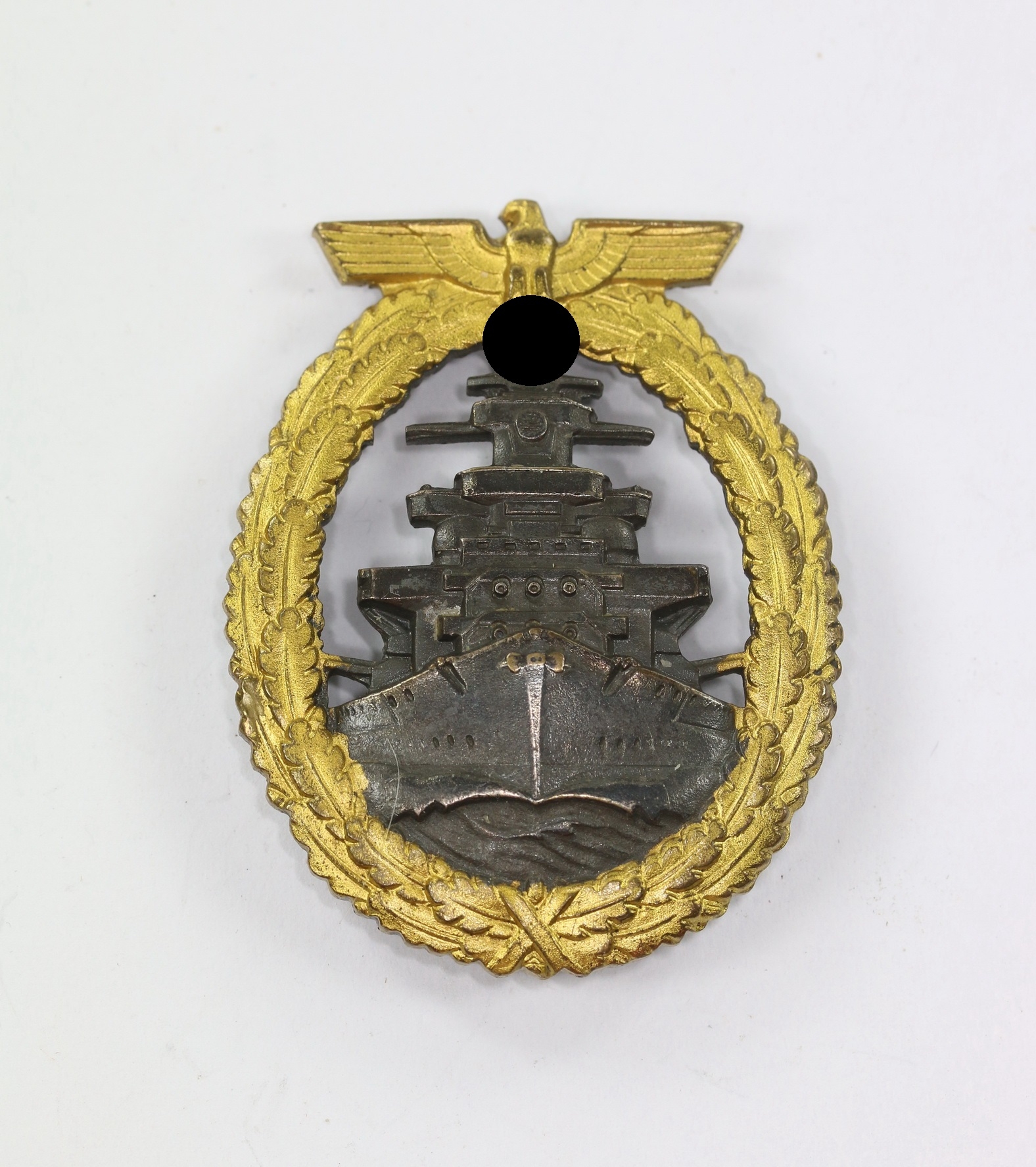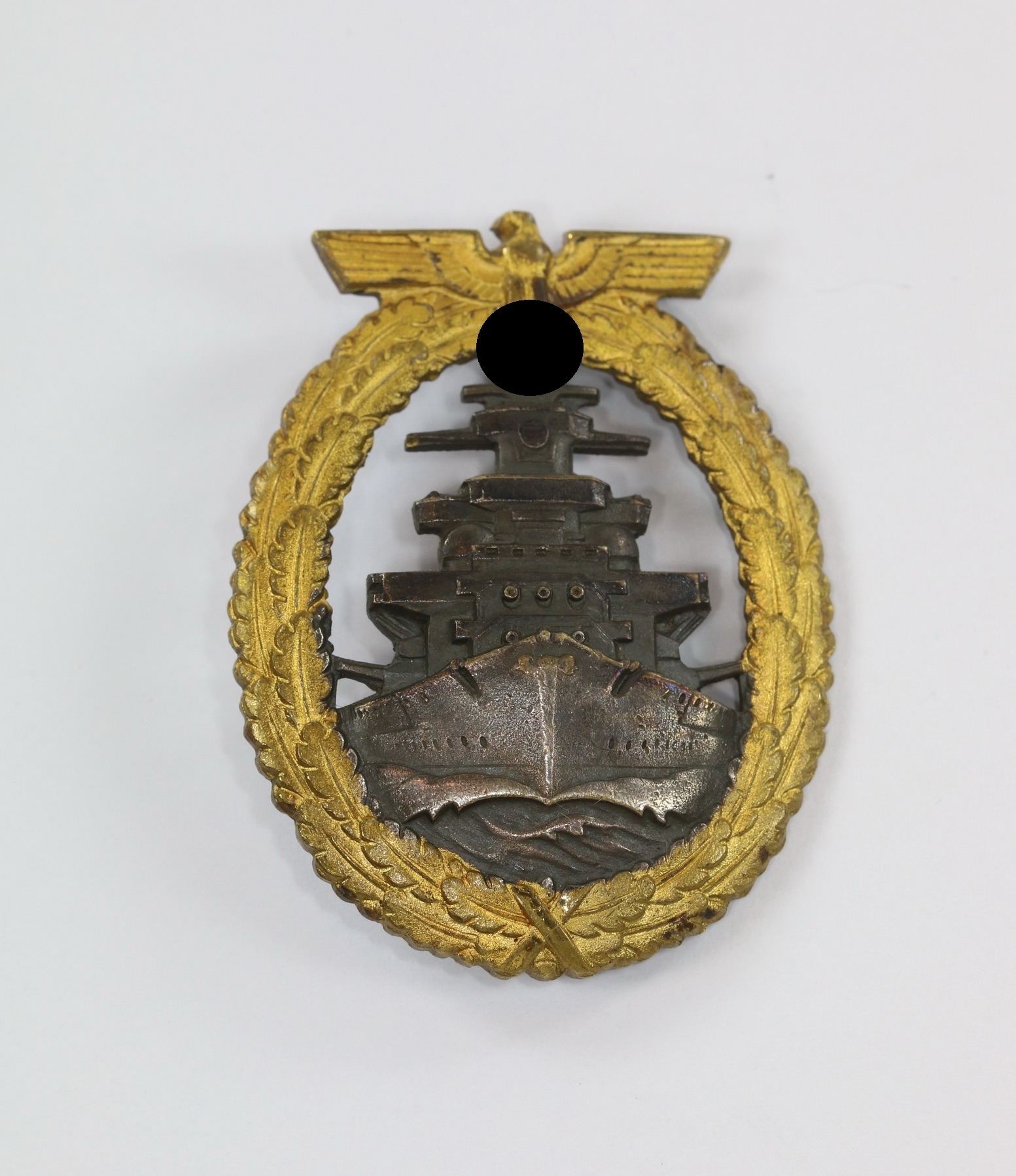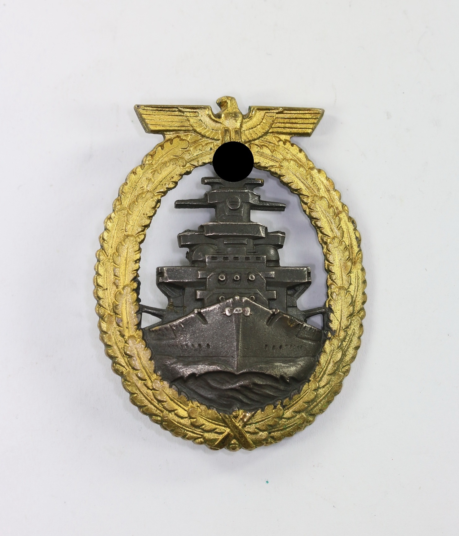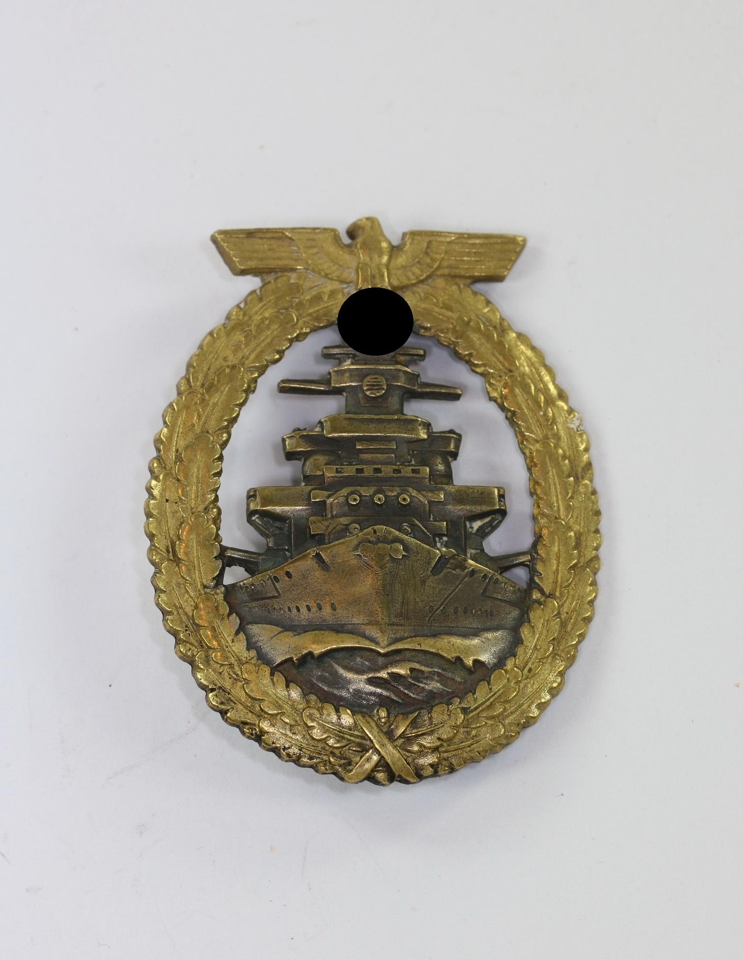 Tombak/brass based and in a very good, barely worn condition. The ship and waves dark oxydised. The wreath with practically all of the gilt plate, the swastika and wreath ties burnished.