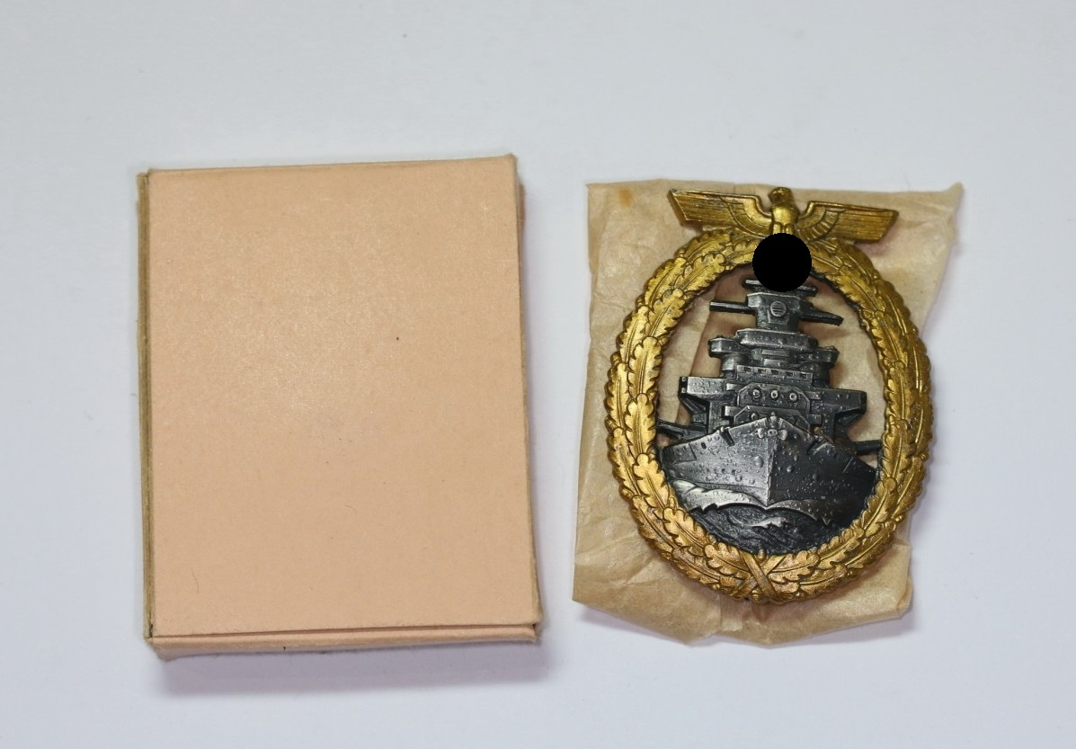 Zinc based and in an excellent, absolutely unworn condition. The wreath with all of the matt gilt plate, the swastika and rims burnished. The battleship with all of the dark oxidised finish. Still in the original tissue paper wrapper.